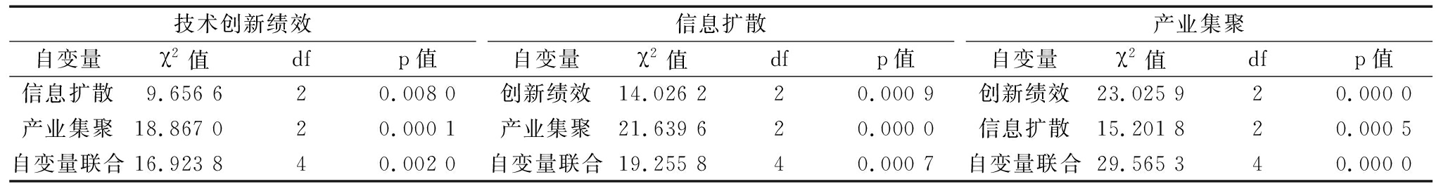 技术创新绩效自变量χ2值dfp值信息扩散自变量χ2值dfp值产业集聚自变量χ2值dfp值信息扩散9.656 6 20.008 0 创新绩效14.026 2 20.000 9 创新绩效23.025 9 20.000 0 产业集聚18.867 0 20.000 1 产业集聚21.639 6 20.000 0 信息扩散15.201 8 20.000 5 自变量联合16.923 8 40.002 0 自变量联合19.255 8 40.000 7 自变量联合29.565 3 40.000 0