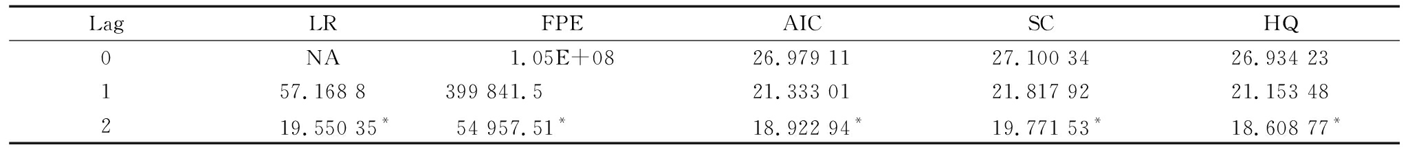 在因果关系检验基础上,对VAR模型进行统计分析和时滞长度判断。对应的统计结果见表2。