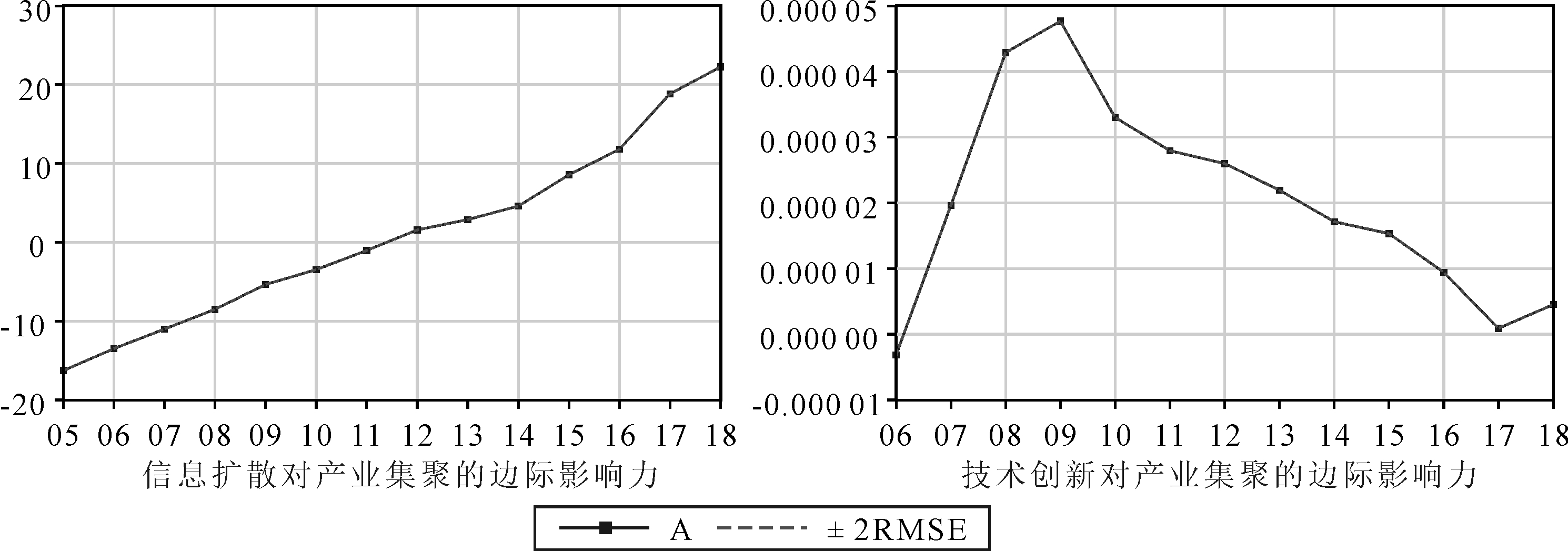 图5显示,信息扩散对产业集聚的边际影响力在2005-2018年呈线性增长态势,而技术创新绩效对产业集聚的边际影响力呈倒U形曲线,且技术创新绩效的边际影响力在2005-2009年呈快速增长趋势,在2009年达到最大值,其后呈缓慢递减趋势,并于2018年开始出现回升趋势。