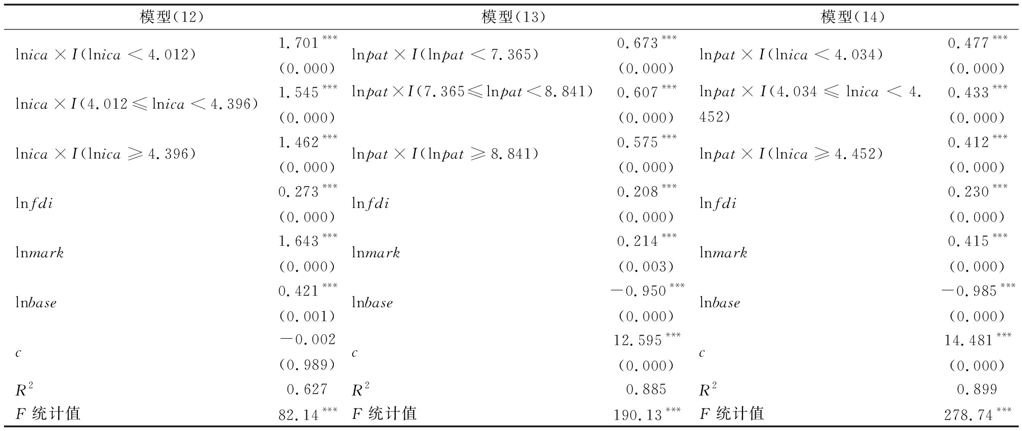 模型(12)模型(13)模型(14)lnica×I(lnica<4.012)1.701***(0.000)lnpat×I(lnpat<7.365)0.673***(0.000)lnpat×I(lnica<4.034)0.477***(0.000)lnica×I(4.012≤lnica<4.396)1.545***(0.000)lnpat×I(7.365≤lnpat<8.841)0.607***(0.000)lnpat×I(4.034≤lnica<4.452)0.433***(0.000)lnica×I(lnica≥4.396)1.462***(0.000)lnpat×I(lnpat≥8.841)0.575***(0.000)lnpat×I(lnica≥4.452)0.412***(0.000)lnfdi0.273***(0.000)lnfdi0.208***(0.000)lnfdi0.230***(0.000)lnmark1.643***(0.000)lnmark0.214***(0.003)lnmark0.415***(0.000)lnbase0.421***(0.001)lnbase-0.950***(0.000)lnbase-0.985***(0.000)c-0.002(0.989)c12.595***(0.000)c14.481***(0.000)R20.627R20.885R20.899F统计值82.14***F统计值190.13***F统计值278.74***
