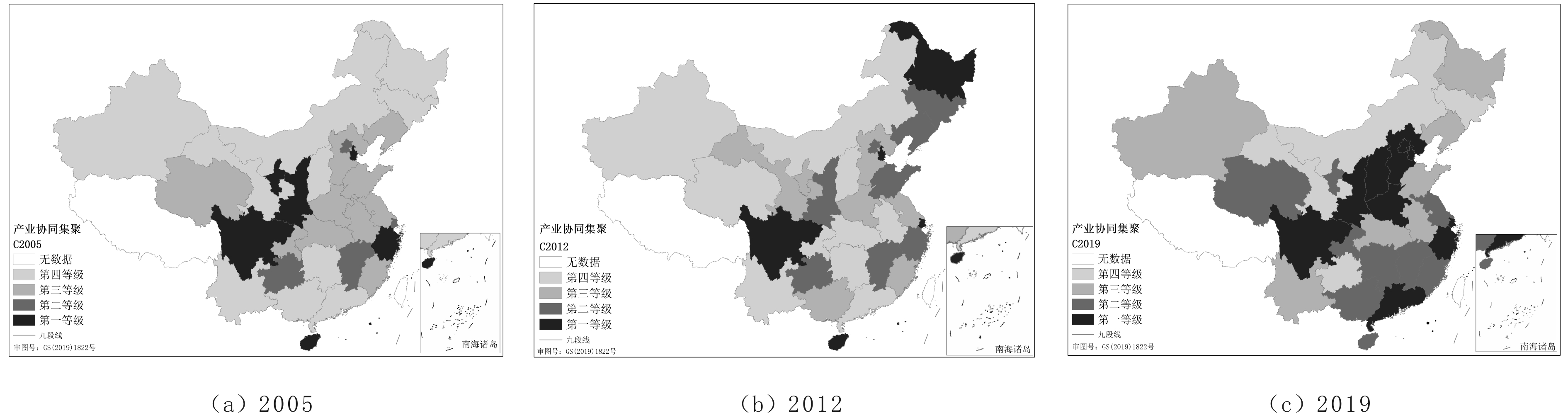 从时间角度看,区域产业协同集聚水平呈三足鼎立的演化趋势。2005年和2012年,处于第一、二层级的有长三角地区(上海、江苏、浙江)、京津冀地区(北京、天津)、西部协同集聚区(四川、重庆、贵州、陕西);2019年,除长三角和京津冀外,位于第一、二层级的还有珠三角地区(广东)。可见,产业协同集聚具有显著空间溢出效应,对邻近省市具有显著提升作用。