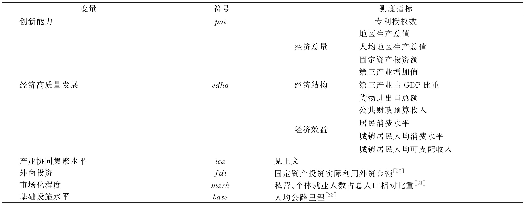 式中,patit表示i地区在t年的创新能力水平;icait-2表示i地区在t-2年的产业协同集聚水平;edhqit表示i地区在t年的经济高质量发展水平,包括经济总量、经济结构和经济效益3个部分,采用熵权法加权得出;fdiit为i地区第t年的固定资产投资实际利用外资金额;markit为i地区第t年私营、个体就业人数占总人口的相对比重;baseit为i地区第t年的人均公路里程,用以反映基础设施水平;μit为误差项。各变量及测度指标见表1。