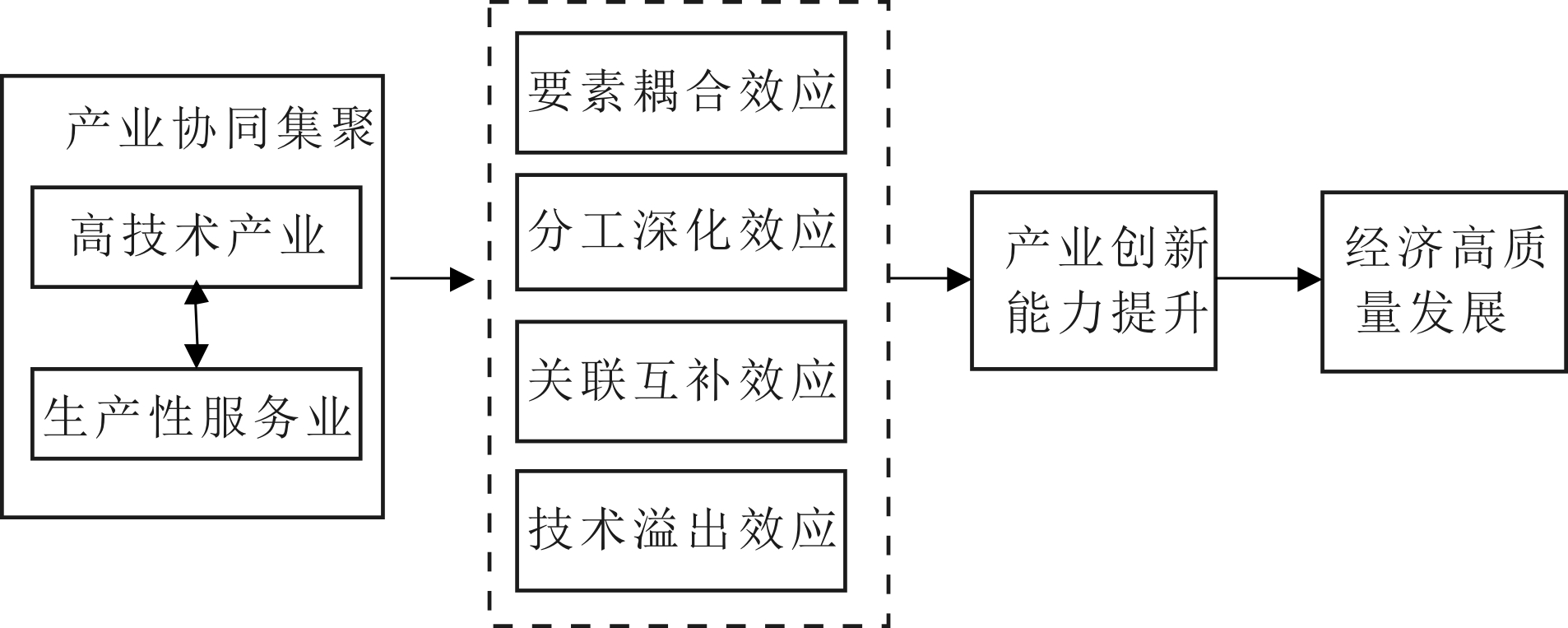 高技术产业与生产性服务业协同集聚通过要素耦合、产业分工深化与延伸、产业关联与互补、技术溢出等效应提升区域产业创新能力,推动产业结构优化升级,进而促进区域经济高质量发展,其影响机理如图1所示。