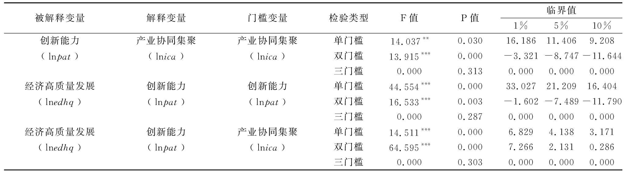 由表2可知,产业协同集聚对创新能力、创新能力对经济高质量发展、产业协同集聚对经济高质量发展均通过了单门槛和双门槛显著性检验,而均未通过三门槛显著性检验。可见,产业协同集聚对创新能力、创新能力对经济高质量发展、产业协同集聚对经济质量发展都存在双门槛效应。