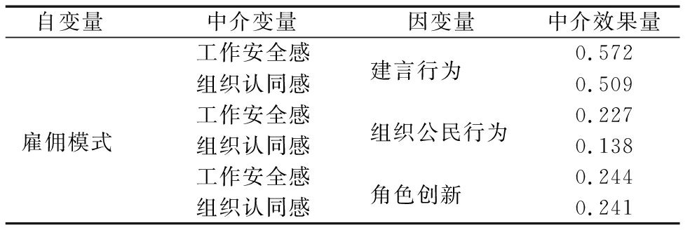 自变量 中介变量 因变量中介效果量雇佣模式工作安全感建言行为0.572组织认同感0.509工作安全感组织公民行为0.227组织认同感0.138工作安全感角色创新0.244组织认同感0.241