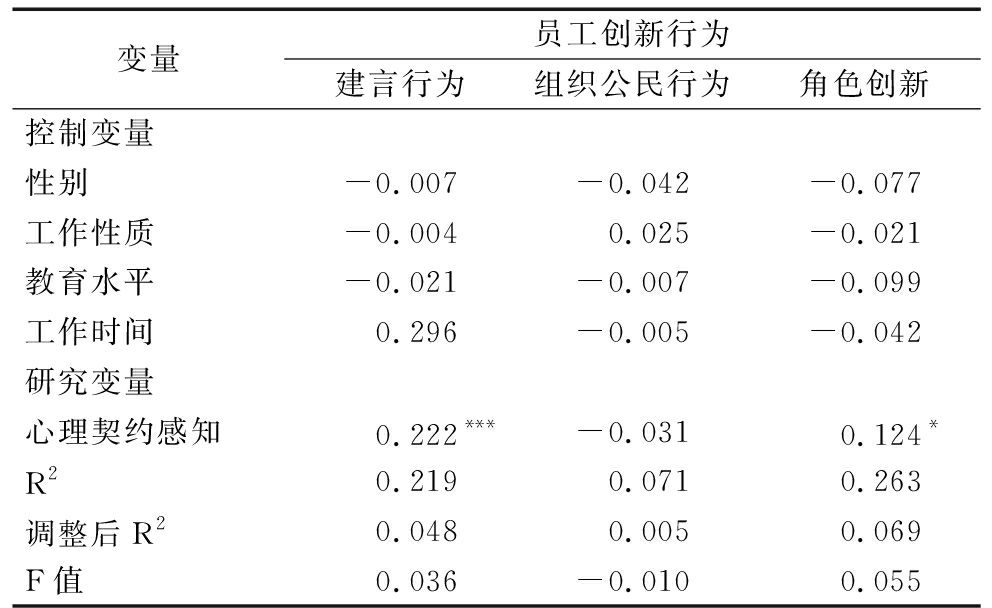 变量员工创新行为建言行为组织公民行为角色创新控制变量性别-0.007-0.042-0.077工作性质-0.0040.025-0.021教育水平-0.021-0.007-0.099工作时间0.296-0.005-0.042研究变量心理契约感知0.222***-0.0310.124*R20.2190.0710.263调整后R20.0480.0050.069F值0.036-0.0100.055