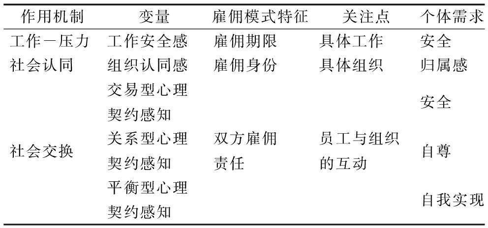 以往对于雇佣模式影响组织行为的研究多关注某一类型的影响机制,缺乏系统化研究体系。因此,对于雇佣模式与员工创新行为间影响机制,一方面应当考虑不同雇佣模式本身所具有的特征,即形成工作-压力进程,另一方面也应当将雇佣模式对员工与组织间关系的影响纳入考虑范畴。员工与组织签订劳动合同进入组织之后会经过组织社会化进程,在这一过程中同时存在两大重要进程,即社会认同与社会交换。因此,本研究通过3个方面进程,即工作-压力、社会认同、社会交换进程,探索雇佣关系模式下员工创新行为的产生机制。在3个方面进程下具体的变量特征、关注点及其反映的个体需求如表1所示。