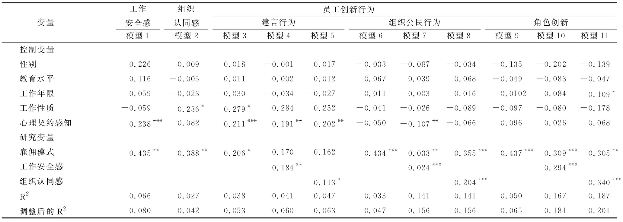 变量 工作安全感模型1组织认同感模型2员工创新行为建言行为模型3模型4模型5组织公民行为模型6模型7模型8角色创新模型9模型10模型11控制变量性别0.2260.0090.018-0.0010.017-0.033-0.087-0.034-0.135-0.202-0.139教育水平0.116-0.0050.0110.0020.0120.0670.0390.068-0.049-0.083-0.047工作年限0.059-0.023-0.030-0.034-0.0270.011-0.0030.0160.01020.0840.109*工作性质-0.0590.236*0.279*0.2840.252-0.041-0.026-0.089-0.097-0.080-0.178心理契约感知0.238***0.0820.211***0.191**0.202**-0.050-0.107**-0.0660.0960.0260.068研究变量雇佣模式0.435**0.388**0.206*0.1700.1620.434***0.033**0.355***0.437***0.309***0.305**工作安全感0.184**0.024***0.294***组织认同感0.113*0.204***0.340***R20.0660.0270.0380.0410.0470.0330.1410.1410.0500.1670.187调整后的R20.0800.0420.0530.0600.0630.0470.1560.1560.0650.1810.201