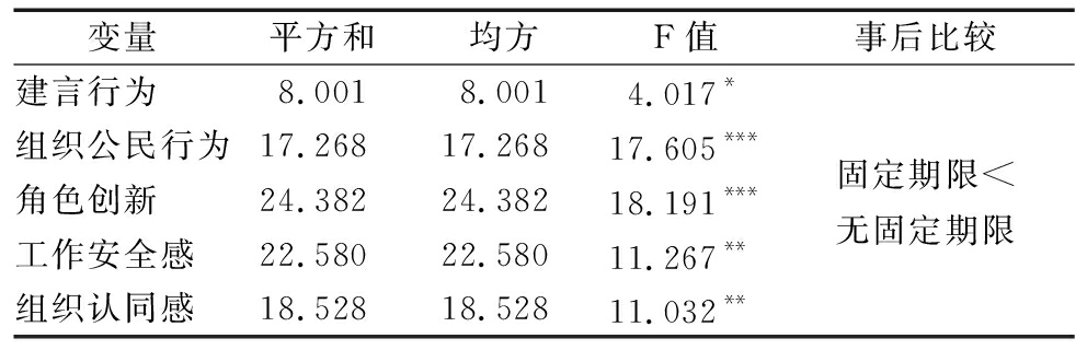 变量平方和均方F值事后比较 建言行为 8.0018.0014.017*固定期限<无固定期限 组织公民行为17.26817.26817.605*** 角色创新 24.38224.38218.191*** 工作安全感 22.58022.58011.267** 组织认同感 18.52818.52811.032**
