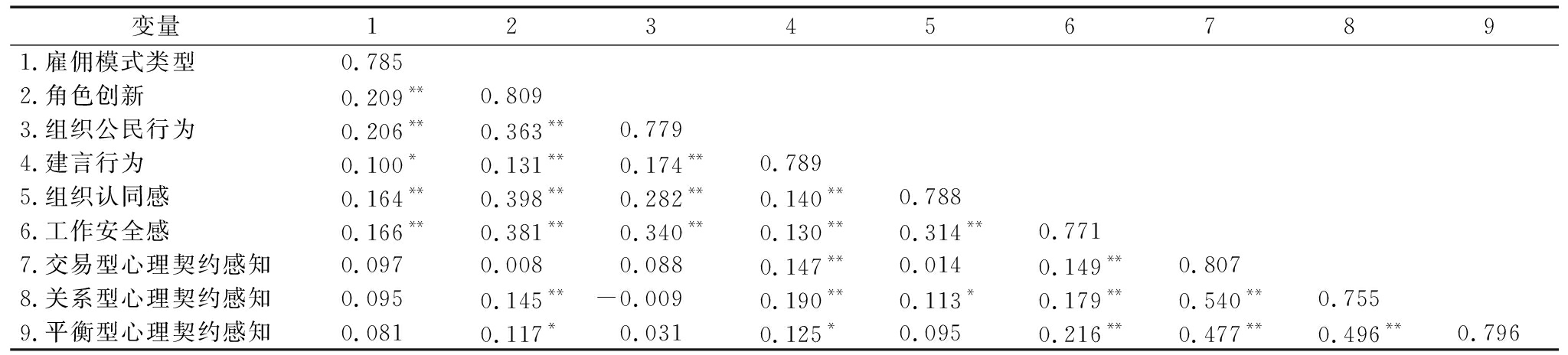 变量1234567891.雇佣模式类型0.7852.角色创新0.209**0.8093.组织公民行为0.206**0.363**0.7794.建言行为0.100*0.131**0.174**0.7895.组织认同感0.164**0.398**0.282**0.140**0.7886.工作安全感0.166**0.381**0.340**0.130**0.314**0.7717.交易型心理契约感知0.0970.0080.0880.147**0.0140.149**0.8078.关系型心理契约感知0.0950.145**-0.0090.190**0.113*0.179**0.540**0.7559.平衡型心理契约感知0.0810.117*0.0310.125*0.0950.216**0.477**0.496**0.796