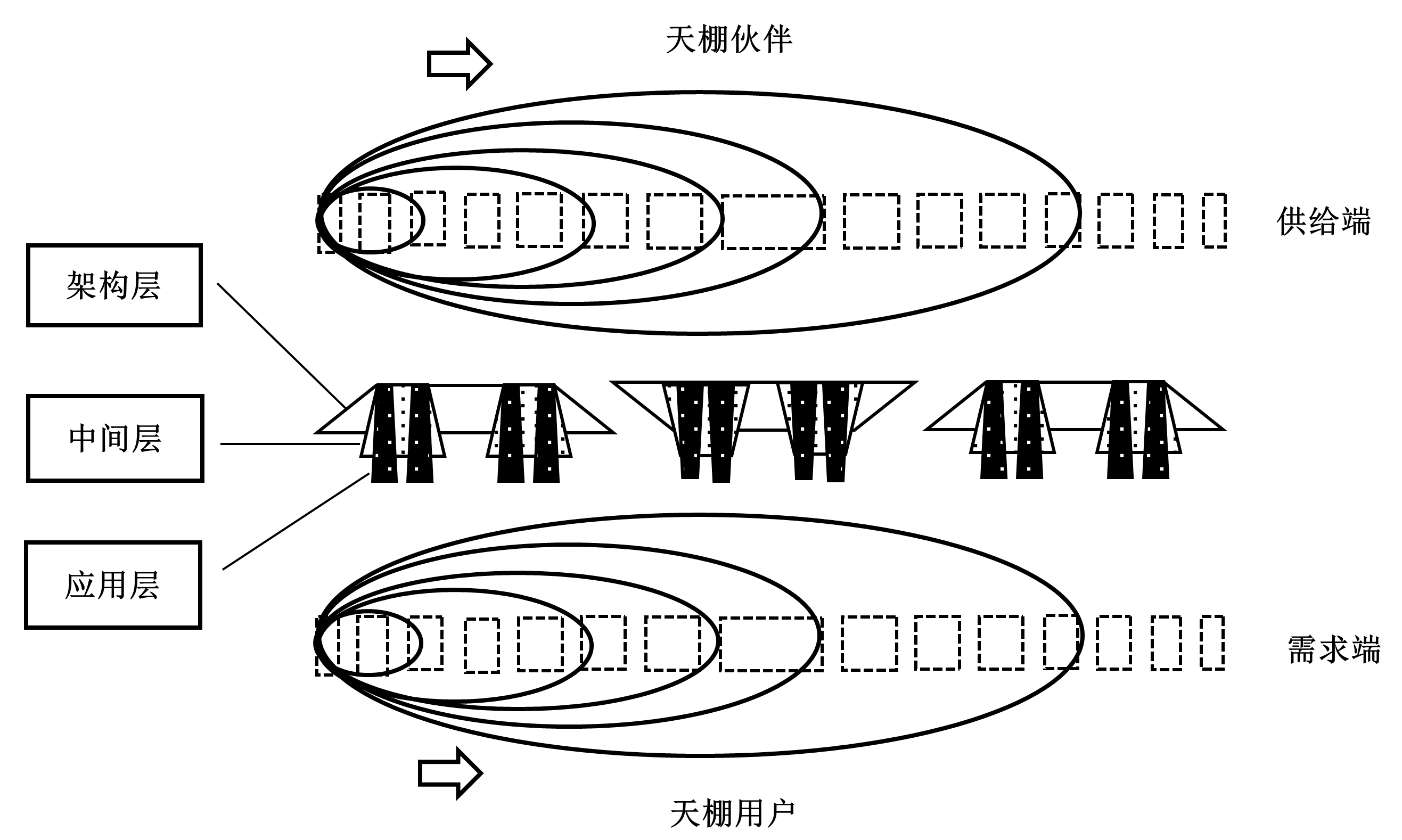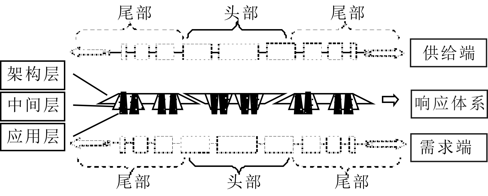 Wheelwright & Clark[21]指出,通过添加、替换和删除功能,可以轻松修改利基市场的衍生品,从而满足个性化需求。数字平台生态系统通过价值互动规则和惯例制定为用户提供产品共享的资产集合,这些资产集合包括组件、流程、知识、人员及其关系。数字平台生态系统通过共享架构,借助于中间层过渡,与应用层相衔接,进一步形成相互嵌套的耦合系统(见图3)。数字平台生态系统支持有效开发产品变体以解决不同利基市场需求,数字平台生态底层架构灵活支持大规模定制,能够同时实现规模经济效应和范围经济效应。在数字平台生态系统中,需求端用户可以快速、有效、安全、可靠地获取各类资源。这种智能响应体系主要通过需求端用户接口和供给端程序接口实现,如通过用户接口实现需求端个性化定制应用,通过程序接口实现供给端资源匹配。数字平台生态系统纵向智能响应体系将数字作为关键要素的功能发挥到极致,实现了供给端与需求端的无缝衔接。