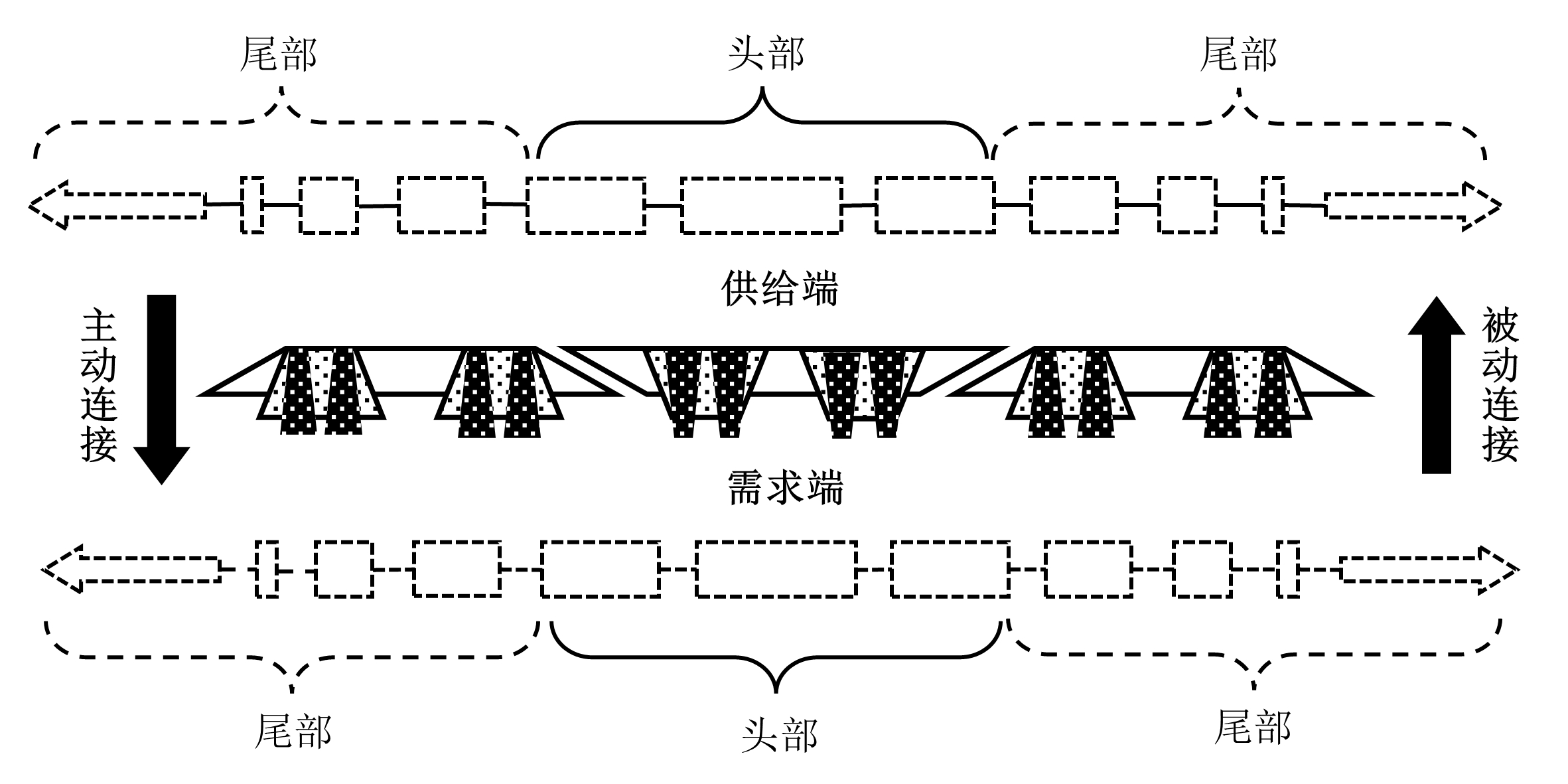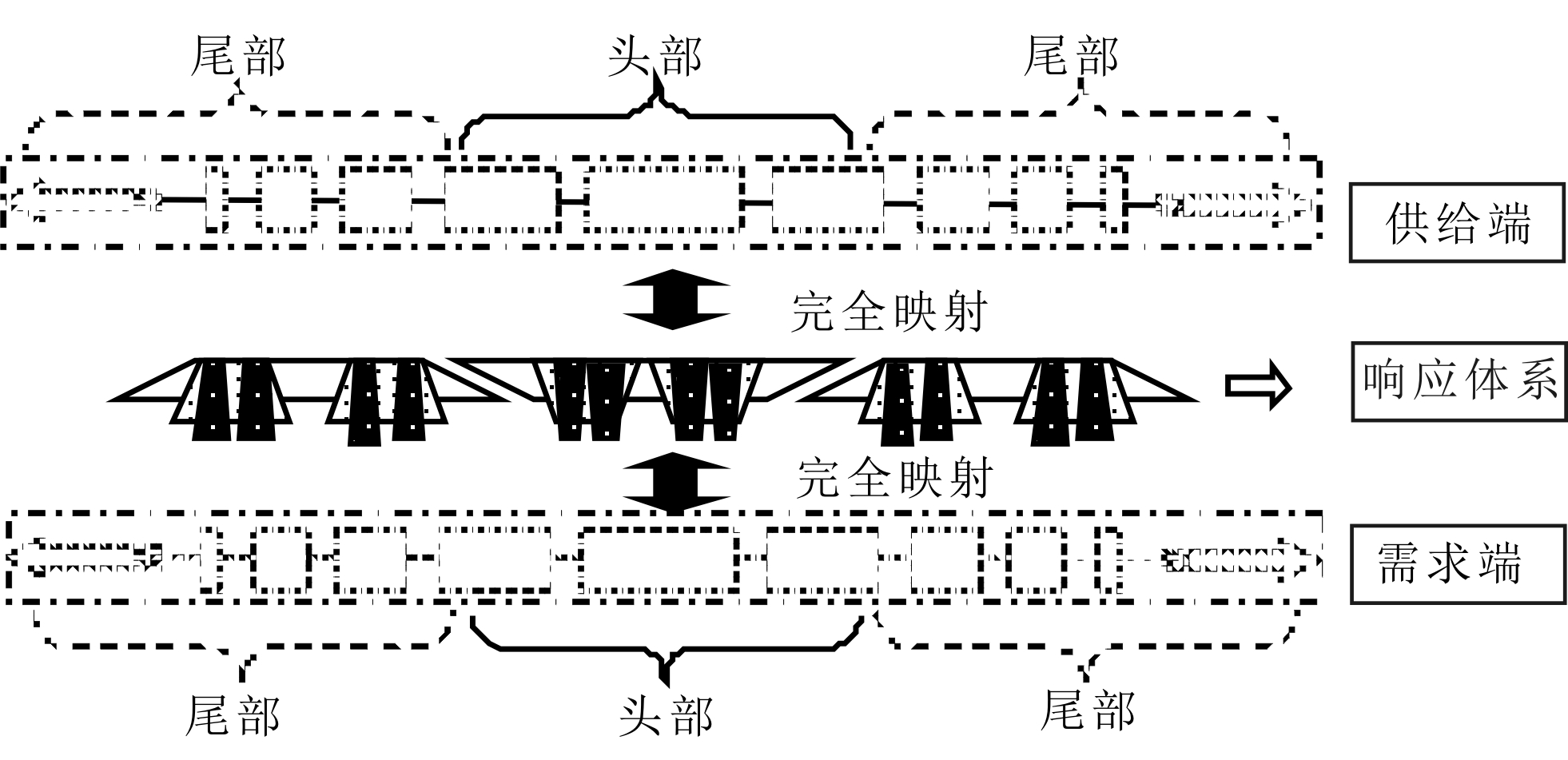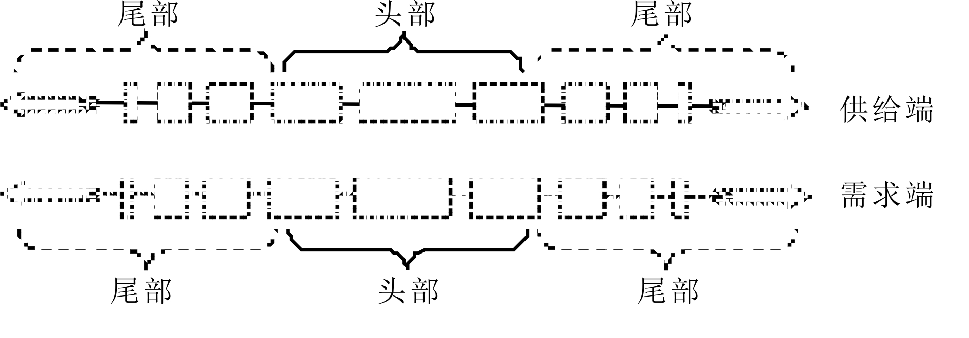 与需求端长尾市场相对应的是供给端价值来源的横向拓展。Seal等[19]指出,数字化创新促使个性化供给形成,分布式供给和主流供给相互补充,形成供给端延拓,个性化闲置资源得到重新审视,形成供给端资源池,供给端也由传统同质性供给(头部)转向多样化供给(尾部),生产工具、生产资料、共享生活空间成为新经济增长点。伴随着需求端价值主张的延拓及供给端冗余资源的共享,供需两端的价值界面实现共同延拓(见图2),需求端和供给端形成更高的匹配组合,并显著促进市场效率提升,价值创造成为价值生成的第三来源。