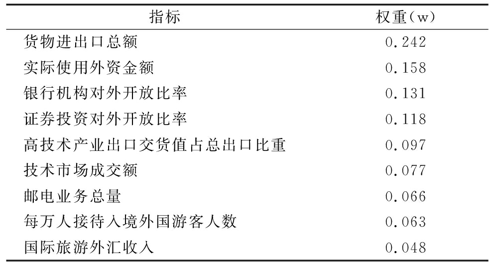 指标权重(w)货物进出口总额0.242实际使用外资金额0.158银行机构对外开放比率0.131证券投资对外开放比率0.118高技术产业出口交货值占总出口比重0.097技术市场成交额0.077邮电业务总量0.066每万人接待入境外国游客人数0.063国际旅游外汇收入0.048