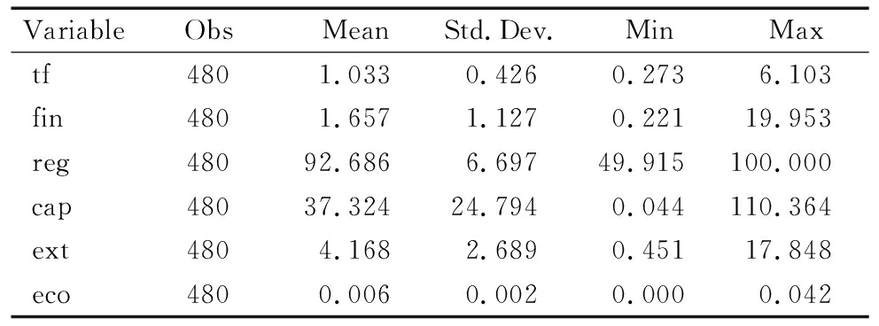 VariableObsMeanStd.Dev.MinMaxtf4801.0330.4260.2736.103fin4801.6571.1270.22119.953reg48092.6866.69749.915100.000cap48037.32424.7940.044110.364ext4804.1682.6890.45117.848eco4800.0060.0020.0000.042