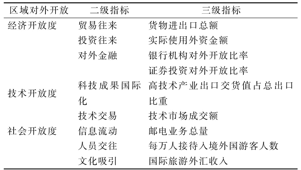 区域对外开放二级指标三级指标经济开放度贸易往来货物进出口总额投资往来实际使用外资金额对外金融银行机构对外开放比率证券投资对外开放比率技术开放度科技成果国际化高技术产业出口交货值占总出口比重技术交易技术市场成交额社会开放度信息流动邮电业务总量人员交往每万人接待入境外国游客人数文化吸引国际旅游外汇收入
