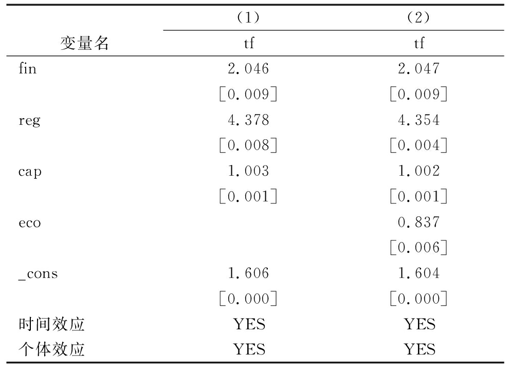 变量名(1)(2)tftffin2.0462.047[0.009][0.009]reg4.3784.354[0.008][0.004]cap1.0031.002[0.001][0.001]eco0.837[0.006]_cons1.6061.604[0.000][0.000]时间效应YESYES个体效应YESYES