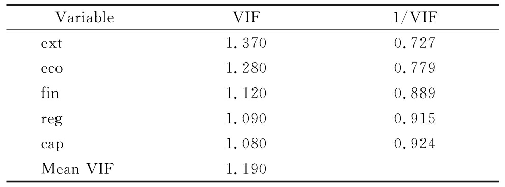 VariableVIF1/VIFext1.3700.727eco1.2800.779fin1.1200.889reg1.0900.915cap1.0800.924Mean VIF1.190