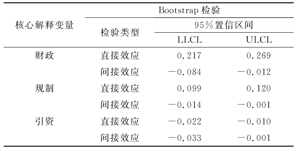 核心解释变量Bootstrap检验检验类型95%置信区间LLCLULCL财政直接效应0.2170.269间接效应-0.084-0.012规制直接效应0.0990.120间接效应-0.014-0.001引资直接效应-0.022-0.010间接效应-0.033-0.001