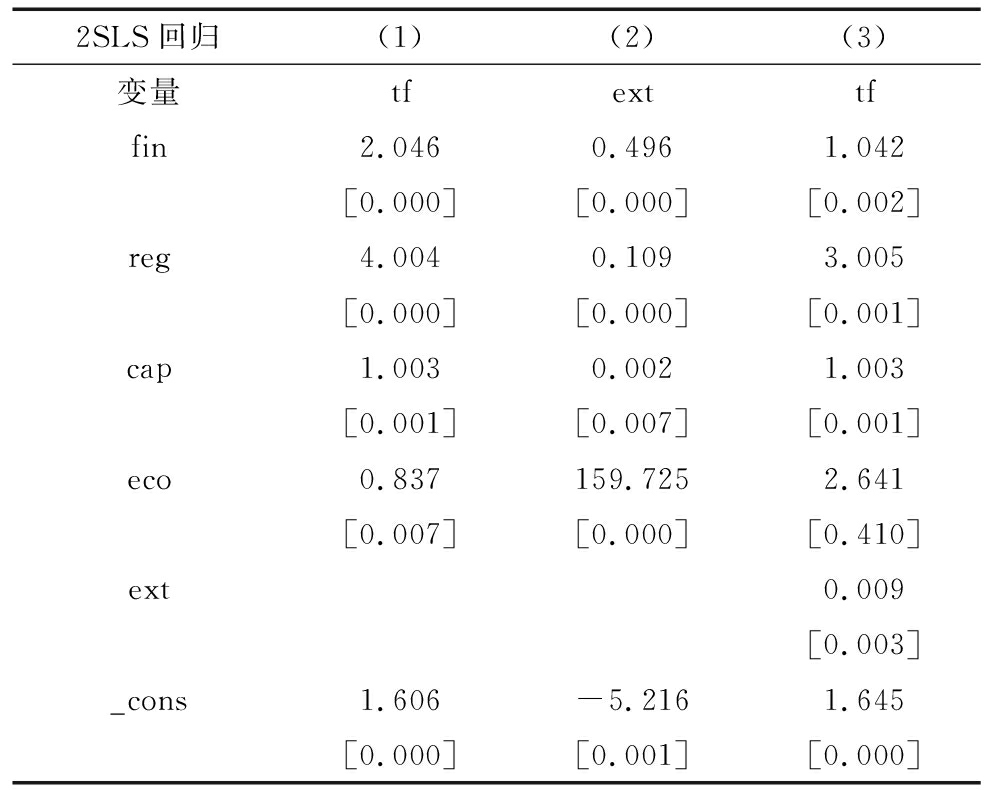 2SLS回归(1)(2)(3)变量tfexttffin2.0460.4961.042[0.000][0.000][0.002]reg4.0040.1093.005[0.000][0.000][0.001]cap1.0030.0021.003[0.001][0.007][0.001]eco0.837159.7252.641[0.007][0.000][0.410]ext0.009[0.003]_cons1.606-5.2161.645[0.000][0.001][0.000]
