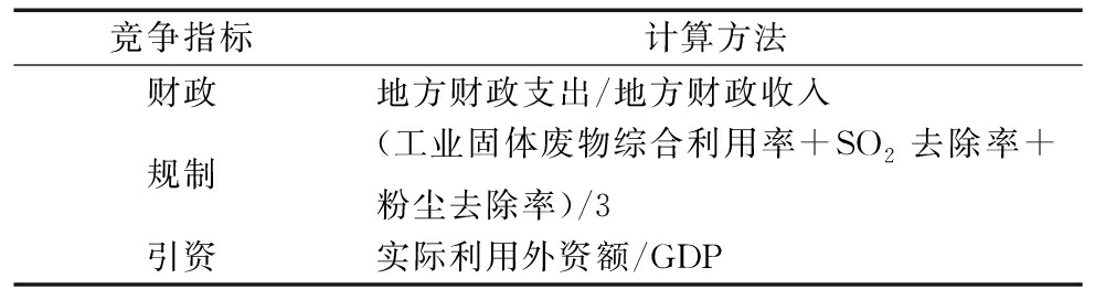 竞争指标计算方法财政地方财政支出/地方财政收入规制(工业固体废物综合利用率+SO2去除率+粉尘去除率)/3引资实际利用外资额/GDP
