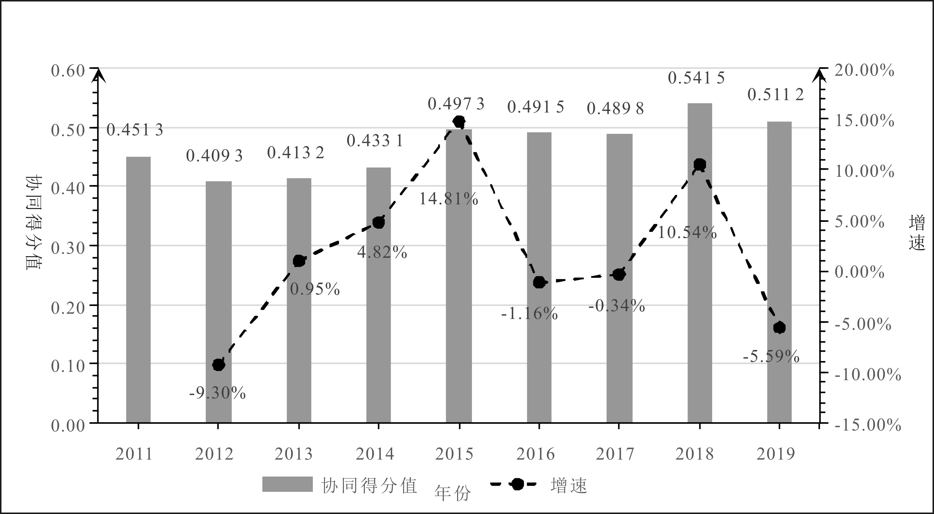 图5 2011—2019年全国金融科技—制造业绿色转型复合系统协同得分均值及增速