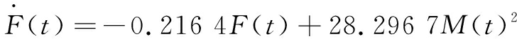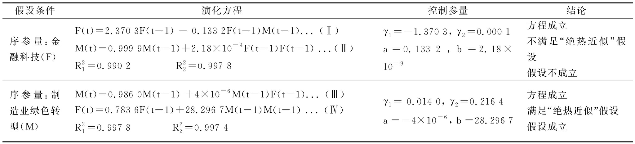 假设条件演化方程控制参量结论序参量:金融科技(F)F(t)=2.370 3F(t-1) - 0.133 2F(t-1)M(t-1)... (Ⅰ)M(t)=0.999 9M(t-1)+2.18×10-9F(t-1)F(t-1) ...(Ⅱ)R21=0.990 2 R22=0.997 8γ1=-1.370 3, γ2 =0.000 1a =0.133 2 , b =2.18×10-9方程成立不满足“绝热近似”假设假设不成立序参量:制造业绿色转型(M)M(t)=0.986 0M(t-1) +4×10-6M(t-1)F(t-1)... (Ⅲ)F(t)=0.783 6F(t-1)+28.296 7M(t-1)M(t-1) ... (Ⅳ)R21=0.997 8 R22=0.997 4γ1 = 0.014 0, γ2=0.216 4a =-4×10-6, b =28.296 7方程成立满足“绝热近似”假设假设成立