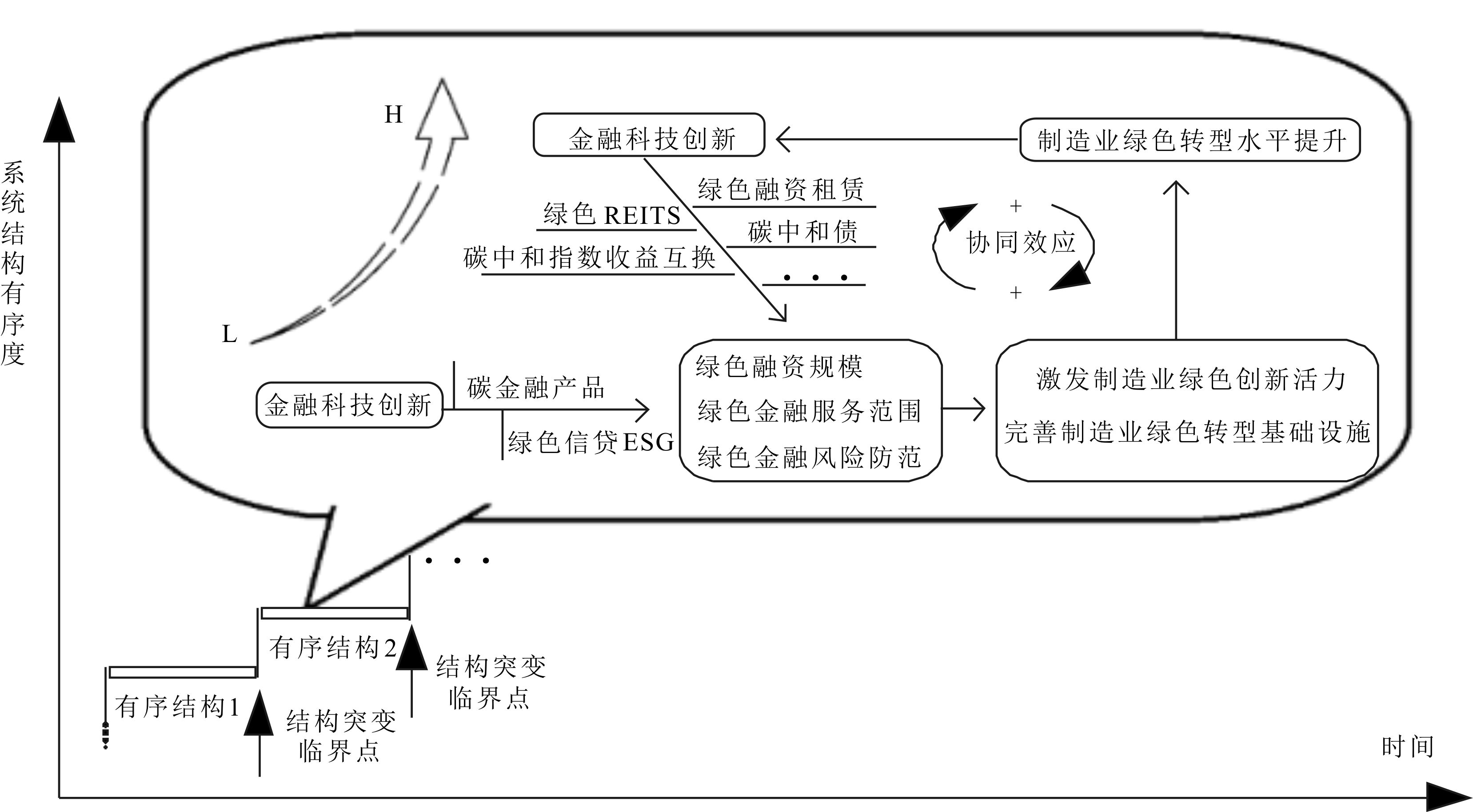系统论是在系统科学理论研究视角下,将研究对象看作一个具有统一性的整体,探索和分析研究对象的有机整体问题。基于系统论视角,可将金融科技与制造业绿色转型视为两个动态演进的系统,二者相互作用、相互影响,共同演化成更为复杂的金融科技—制造业绿色转型复合系统。根据协同学理论,复合系统中两个子系统间的相互作用会随时间发展从无序变为有序,或从低级有序变为高级有序,在这个过程中,子系统间可能产生相互促进的协同效应。在金融科技—制造业绿色转型复合系统从无序向有序结构、从低级有序向高级有序结构突变的临界点,绿色制造工程范畴中的制造业绿色转型企业与金融科技公司、传统金融机构、金融科技监管机构等众多市场主体之间的相互作用(竞争与合作)会被非线性作用机制放大,从而使复合系统突破线性失稳点,迅速形成控制复合系统动态演化方向和结构的序参量,在序参量驱动下,复合系统的新结构、新秩序、新模式得以有序建立。