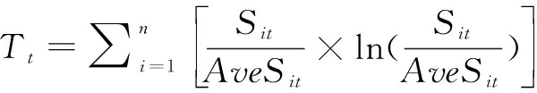 为进一步量化金融科技—制造业绿色转型复合系统协同水平的区域差异,参考熊晓炼和樊健[25]的研究,采用泰尔指数(Theil index)进行测度,其数值在0~1之间,数值越大代表区域协同水平差异越大。泰尔指数测算公式为: