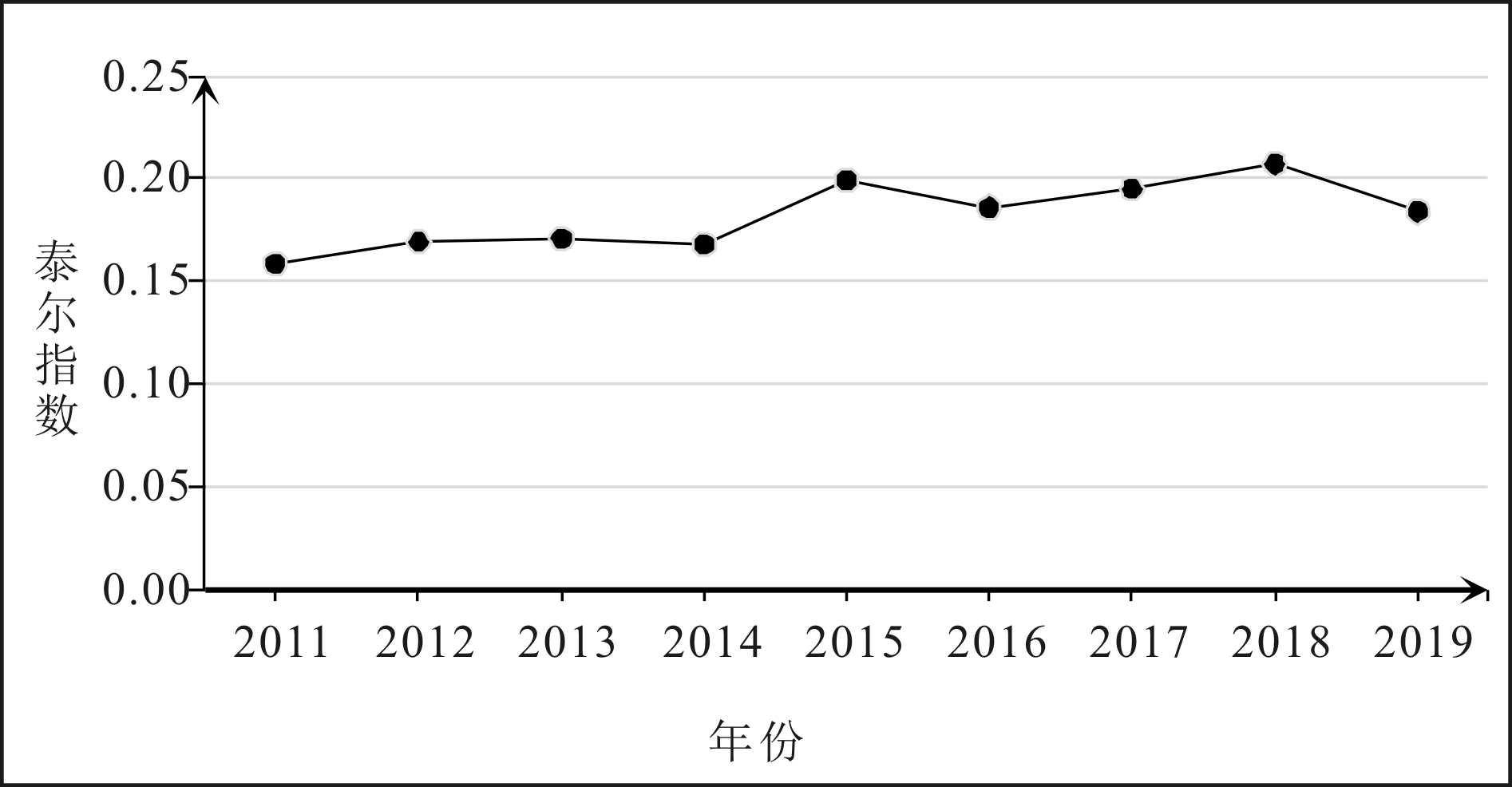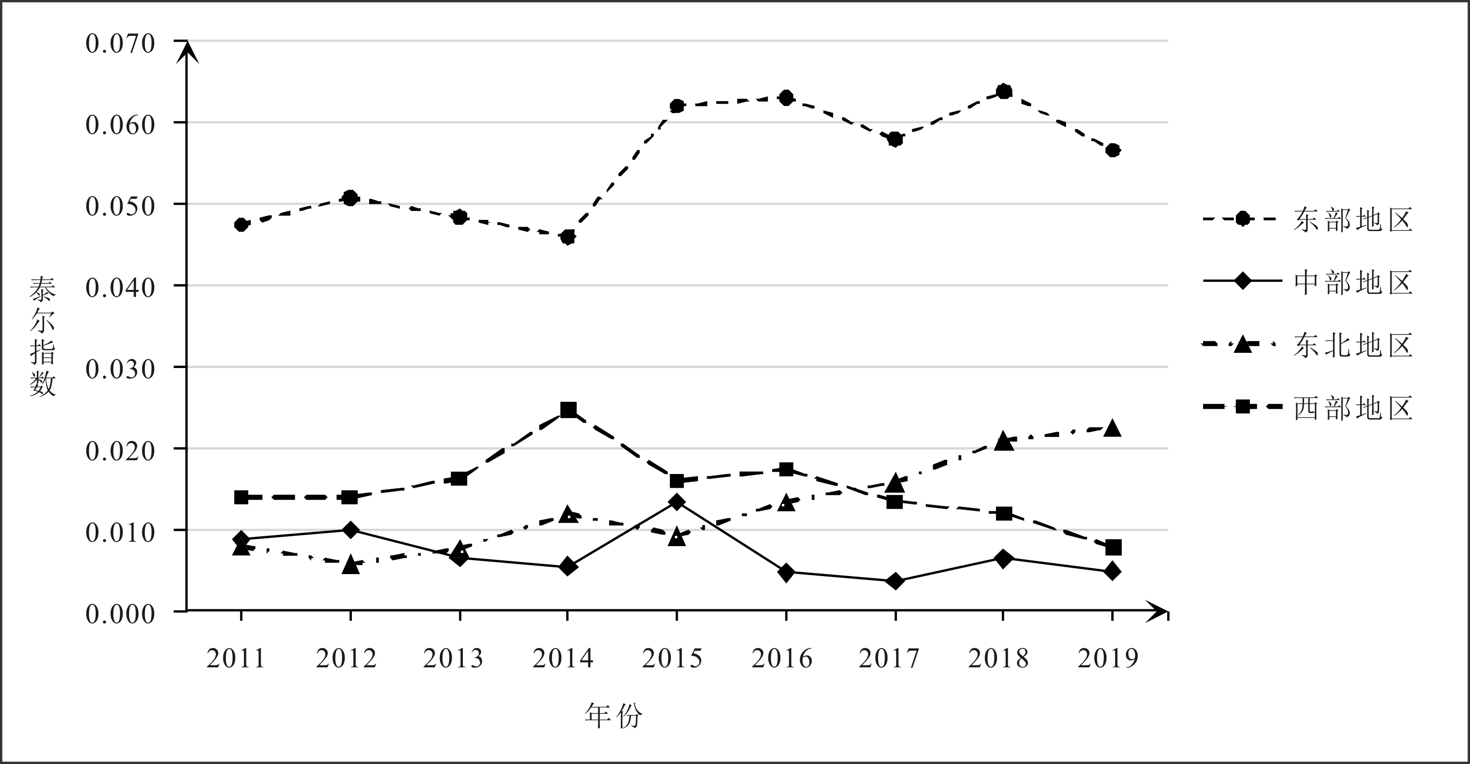 如图6所示,2011—2019年全国范围金融科技—制造业绿色转型复合系统区域协同水平差异的泰尔指数在0.16~0.21之间,表明全国范围的区域差异较小,但整体上有扩大态势,并在2015年和2018年达到局部最大。如图7所示,四大经济区域泰尔指数均在0.07以下,与全国范围的协同水平差异相比,四大经济区域协同水平差异较小。