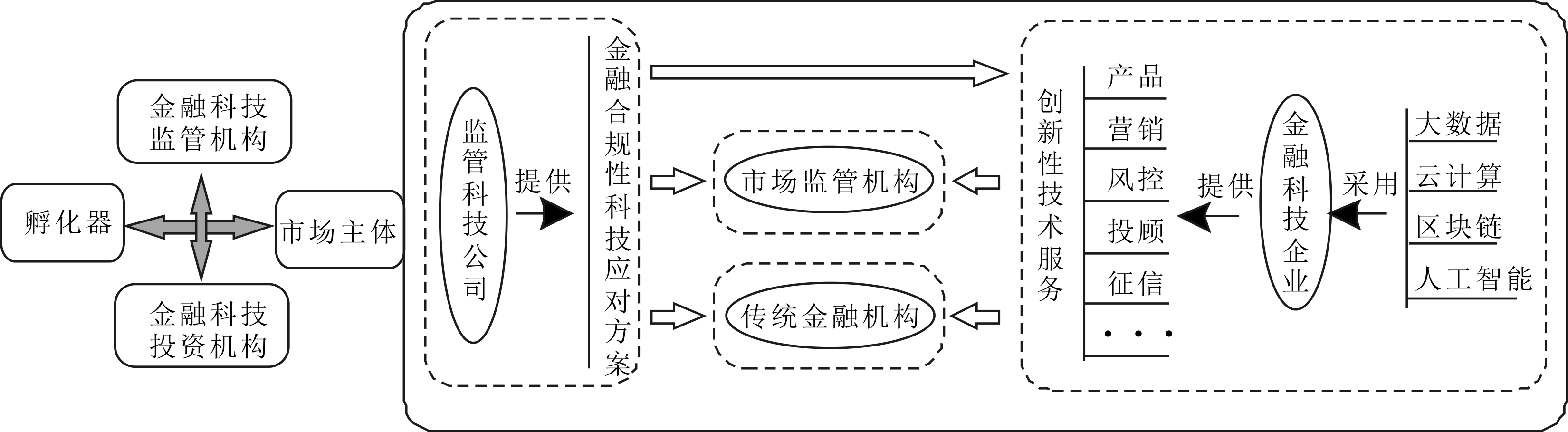 由监管机构、市场主体、孵化与融资机构等要素组成的金融科技体系也是一个不断发展运动的有机整体(见图2),通过各要素之间的相互作用、相互联系、相互依赖,推动整个系统不断发展。金融科技企业是市场运行的重要主体,采用大数据、云计算、人工智能和区块链等科技手段提供创新性金融服务,同时在产品、服务、营销、风控、投顾及征信等领域为金融机构和市场监管机构提供创新性技术服务。金融科技企业与提供金融合规性科技应对方案的监管科技公司和传统金融机构一同组成金融科技体系的市场主体,其与商业模式孵化器、投资机构和监管机构等共同构成复杂的金融科技体系。