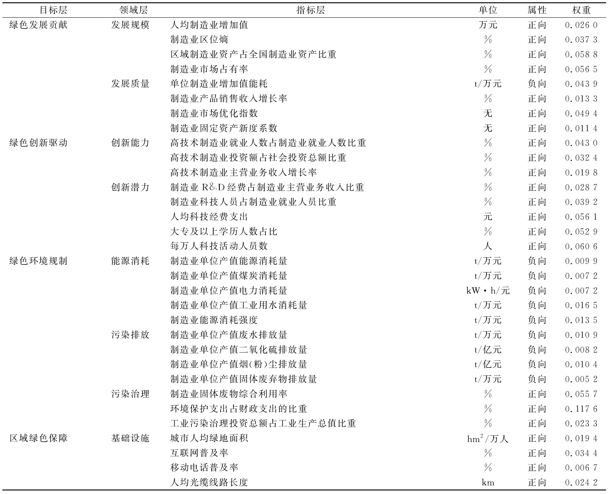 目标层领域层指标层单位属性权重绿色发展贡献发展规模人均制造业增加值万元正向0.026 0 制造业区位熵%正向0.037 3 区域制造业资产占全国制造业资产比重%正向0.058 8 制造业市场占有率%正向0.056 5 发展质量单位制造业增加值能耗t/万元负向0.043 9 制造业产品销售收入增长率%正向0.013 3 制造业市场优化指数无正向0.049 4 制造业固定资产新度系数无正向0.011 4 绿色创新驱动创新能力高技术制造业就业人数占制造业就业人数比重%正向0.043 0 高技术制造业投资额占社会投资总额比重%正向0.032 4 高技术制造业主营业务收入增长率%正向0.019 8 创新潜力制造业R&D经费占制造业主营业务收入比重%正向0.028 7 制造业科技人员占制造业就业人员比重%正向0.039 2 人均科技经费支出元正向0.056 1 大专及以上学历人数占比%正向0.052 9 每万人科技活动人员数人正向0.060 6 绿色环境规制能源消耗制造业单位产值能源消耗量t/万元负向0.009 9 制造业单位产值煤炭消耗量t/万元负向0.007 2 制造业单位产值电力消耗量kW·h/元负向0.007 2 制造业单位产值工业用水消耗量t/万元负向0.016 5 制造业能源消耗强度t/万元负向0.013 5 污染排放制造业单位产值废水排放量t/万元负向0.010 9 制造业单位产值二氧化硫排放量t/亿元负向0.008 2 制造业单位产值烟(粉)尘排放量t/亿元负向0.010 4 制造业单位产值固体废弃物排放量t/万元负向0.005 2 污染治理制造业固体废物综合利用率%正向0.055 7 环境保护支出占财政支出的比重%正向0.117 6 工业污染治理投资总额占工业生产总值比重%正向0.023 3 区域绿色保障基础设施城市人均绿地面积hm2/万人正向0.019 4 互联网普及率%正向0.034 4 移动电话普及率%正向0.006 7 人均光缆线路长度km正向0.024 2