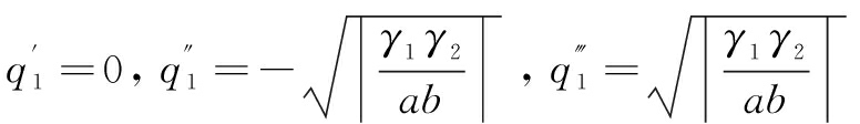 金融科技—制造业绿色转型复合系统的平衡点由式(4)等于0确定,当 γ1* γ2* a * b > 0时,方程存在唯一解q1=0;当 γ1* γ2* a * b<0时,方程存在3个解,即: