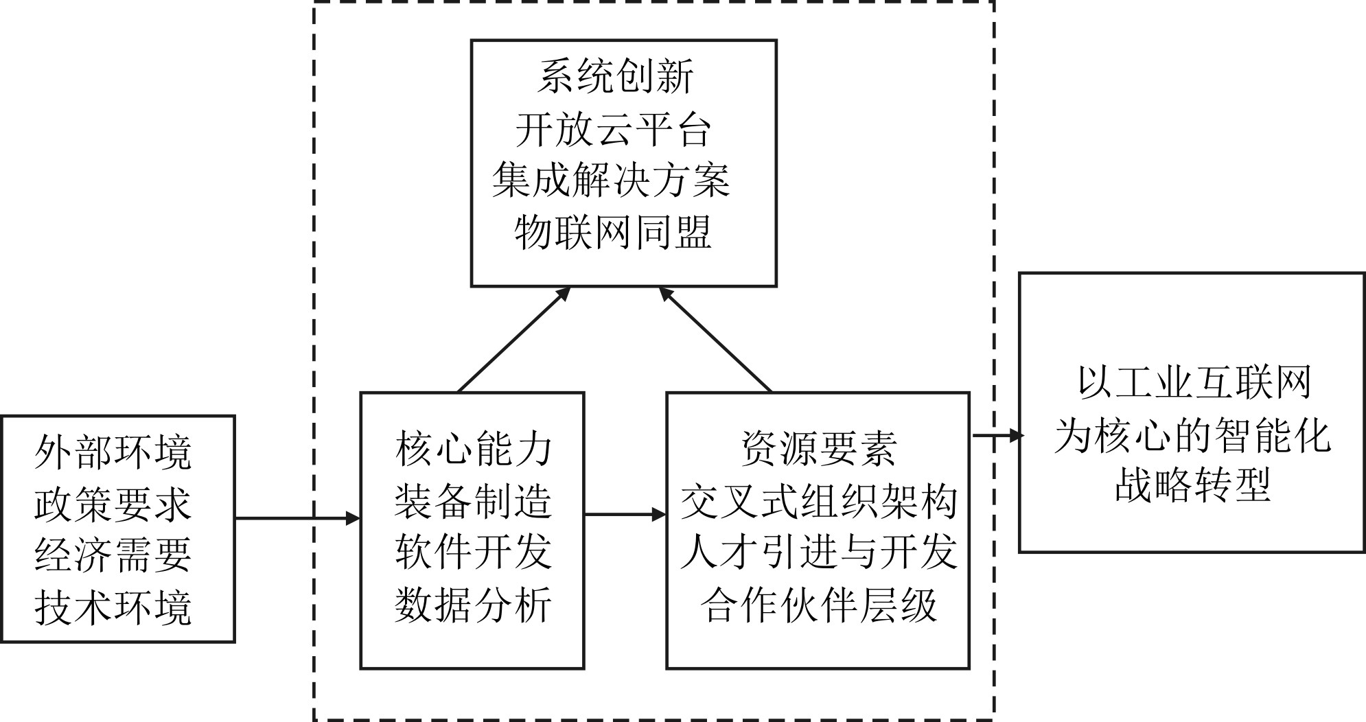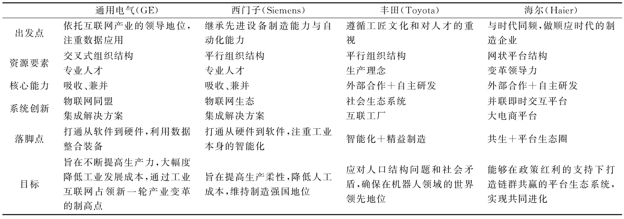 通过分析以上4家制造企业智能化战略转型过程发现,不同国家企业因资源禀赋差异在转型驱动力、变革逻辑以及发展形式等方面存在显著差异。首先,GE、西门子和丰田在智能化转型驱动力上基本一致,都是依靠国家先进信息化水平和雄厚的工业基础,本质上是宏观环境中的技术因素主导企业战略变革。对于海尔而言,既无工业基础支撑,也没具体的国内做法可以借鉴。因此,海尔更多的是依赖顶层设计,利用制度红利驱动智能化转型,这在一定程度上说明国家整体发展水平影响着制造企业智能化转型升级。其次,在变革逻辑上,GE、西门子和丰田主要遵循“核心能力→资源要素→系统创新”的线性发展规律,即凭借外部技术环境优势率先提升企业核心能力,再让资源要素与之适配,进而推动企业系统整体创新。而海尔选择“资源要素+核心能力→系统创新”的变革逻辑,即同时发展资源要素与核心能力,以齐头并进的方式促使系统创新。最后,在发展形式上,GE、西门子、丰田和海尔都选择以“抱团取暖”的方式实现战略转型升级,但从合作对象与合作方式看,不同国家的企业选择具有显著差别。GE和西门子作为欧美发达国家制造业的典型代表,继承了国家优势基础,主要通过收购或入股领先互联网企业和装备制造企业提升自身整体实力;丰田一方面基于传统工匠精神追求自主研发和精益制造,另一方面与先进制造商和互联网巨头签署合作协议,通过共建互联工厂推动产业集群智能化转型;海尔则将目标聚焦于国内众多小微创客,以共生关系取代合作协议,即海尔赋能小微创客,为其提供平台资源,创客群体反过来扮演海尔生态链中的重要一环。创客在提升自身创造力的同时,可以强化海尔价值创造能力,彼此以共生共创的发展形式实现共赢。