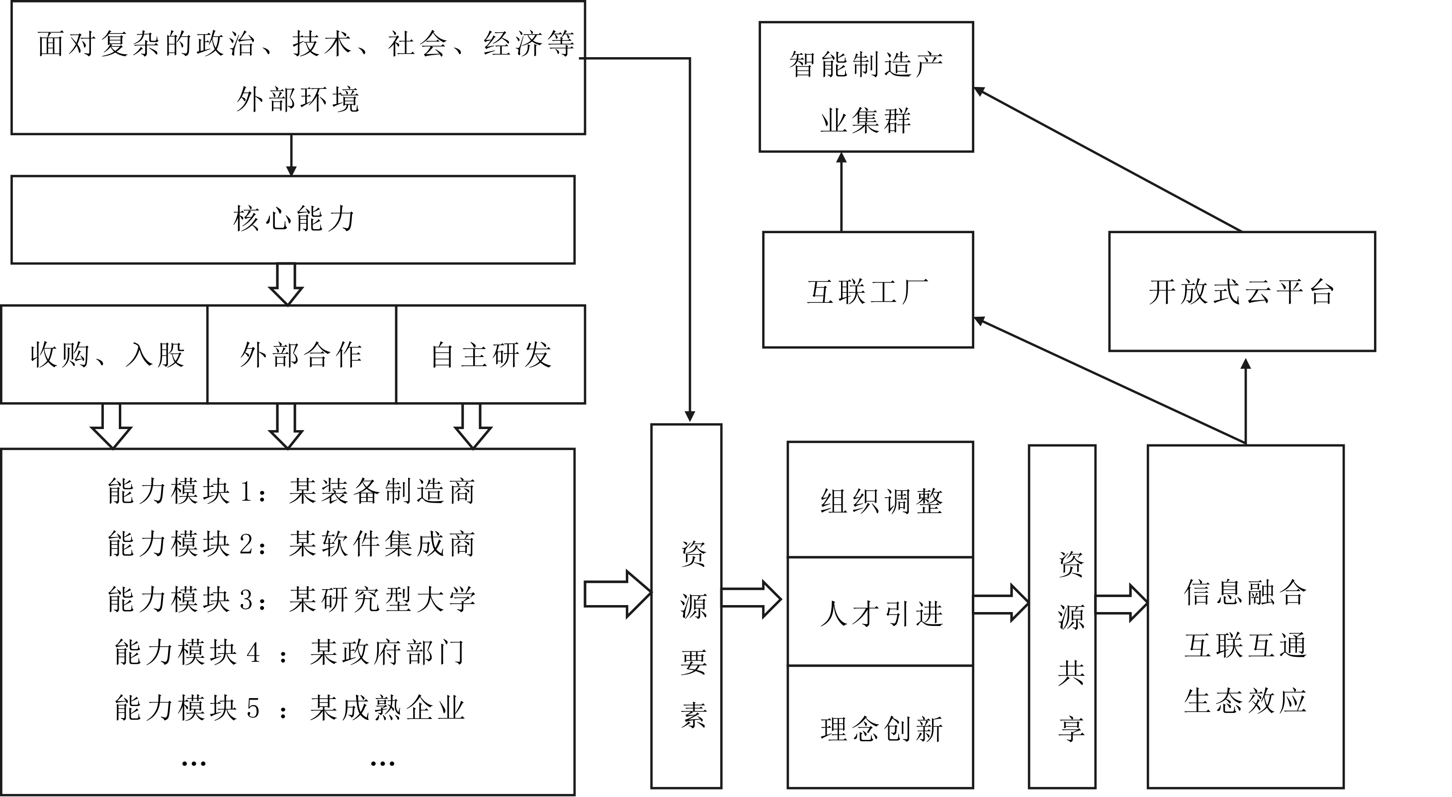 (4)系统创新。制造企业通过系统创新进一步推动智能化战略实施,并通过信息融合、互联互通、生态效应搭建云端平台与互联工厂,从而形成智能制造产业集群。