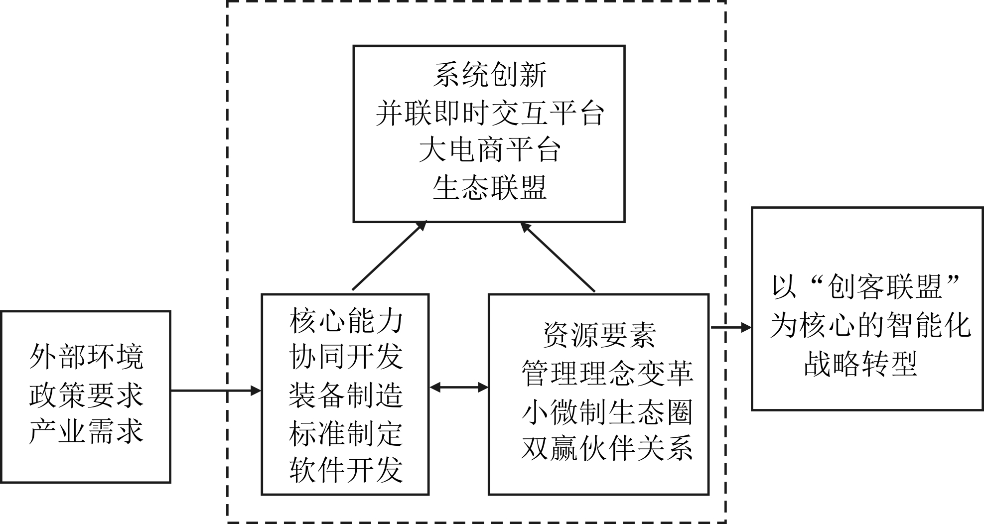 (3)转型成熟期,制造企业系统创新表现形式有3种:一是掌握完整的技术链条,搭建基于开放式云平台的物联网生态系统,具备依靠自我驱动生成集成解决方案的能力;二是与产业环境共建基于宽松标准体系的互联工厂,打造“M2M”的互联互通生产模式,进一步提升信息融合深度;三是瞄准众多小微创客,以共创共赢为目的形成共生发展的新模式,构建开放式平台生态圈。