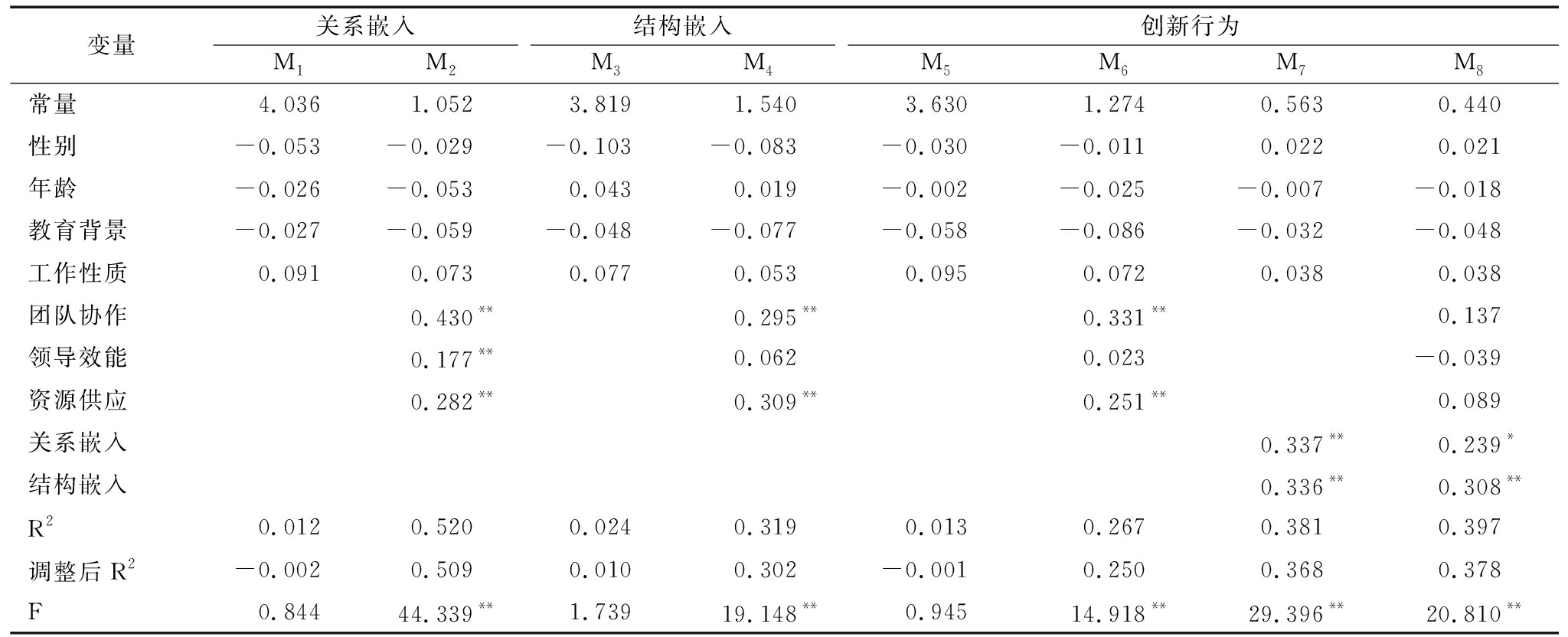 各变量的均值、标准差及相关系数如表2所示,组织创新氛围的3个维度,即团队协作与关系嵌入(β=0.634,p<0.01)、结构嵌入(β=0.462,p<0.01)和创新行为(β=0.448,p<0.01)均显著正相关,领导效能与关系嵌入(β=0.487,p<0.01)、结构嵌入(β=0.320,p<0.01)和创新行为(β=0.275,p<0.01)均显著正相关,资源供应与关系嵌入(β=0.538,p<0.01)、结构嵌入(β=0.466,p<0.01)和创新行为(β=0.403,p<0.01)显著正相关。同时,关系嵌入(β=0.560,p<0.01)和结构嵌入(β=0.557,p<0.01)与创新行为均显著正相关。因此,假设得到基本验证。