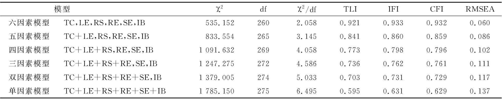 模型 χ2dfχ2/dfTLIIFICFIRMSEA六因素模型TC,LE,RS,RE,SE,IB535.1522602.0580.9210.9330.9320.060五因素模型TC+LE,RS,RE,SE,IB833.5542653.1450.8410.8600.8590.086四因素模型TC+LE+RS,RE,SE,IB1 091.6322694.0580.7730.7980.7960.102三因素模型TC+LE+RS+RE,SE,IB1 247.2752724.5860.7360.7620.7610.111双因素模型TC+LE+RS+RE+SE,IB1 379.0052745.0330.7030.7310.7290.117单因素模型TC+LE+RS+RE+SE+IB1 785.1502756.4950.5950.6310.6290.137