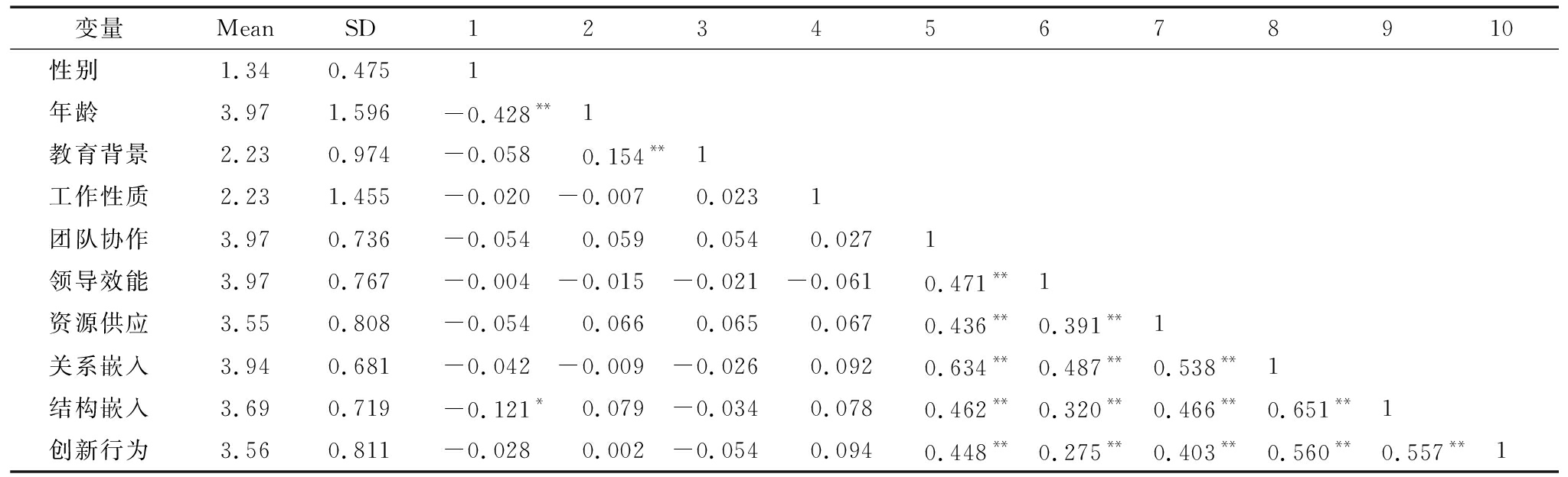 变量MeanSD12345678910性别 1.34 0.475 1 年龄 3.971.596 -0.428**1 教育背景2.23 0.974 -0.0580.154**1 工作性质2.23 1.455 -0.020-0.0070.0231 团队协作3.97 0.736 -0.0540.0590.0540.0271 领导效能3.97 0.767 -0.004-0.015-0.021-0.0610.471**1 资源供应3.55 0.808 -0.0540.0660.0650.0670.436**0.391**1 关系嵌入3.94 0.681 -0.042-0.009-0.0260.0920.634**0.487**0.538**1 结构嵌入3.69 0.719 -0.121*0.079-0.0340.0780.462**0.320**0.466**0.651**1 创新行为3.56 0.811 -0.0280.002-0.0540.0940.448**0.275**0.403**0.560**0.557**1