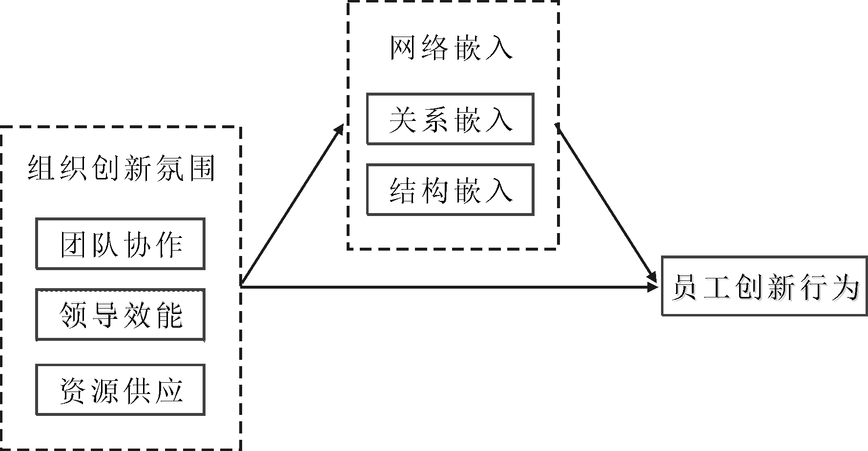 资源保存理论可以解释创新活动等压力情境下员工如何获取资源和避免资源损失。该理论提出,个体有保存、维持和获取资源的倾向,初始资源较多的个体获取资源的能力较强,个体也需要投入资源以获取更多资源[10]。孤立的个体如果不能借由组织的创新支持获得突破组织边界的网络资源,就会选择保存现有资源以避免高风险创新活动。网络嵌入是网络中个体间交互形成的关系以及整个网络属性对网络主体经济行为产生的影响,嵌入网络的行为主体能够从网络中获得独特的资源和机会。在网络中,员工能够与网络内部其他行为主体建立长期稳定的信任与互惠关系,传递隐性知识与信息,获取关键异质性资源,激发创新行为。积极的组织创新氛围有助于员工完成初始资源积累和整合,为其进一步在网络中投资和获取资源提供机会[11]。员工在网络中占据影响力地位并建立稳定互惠关系后,能够跨越组织边界接触丰富的隐性知识,获得稳定的网络异质性资源,拓展关系渠道,在激烈的创新竞争中取得先机。本文从社会网络视角出发,基于资源保存理论,探究组织创新氛围不同维度对员工创新行为的作用机制,以及网络嵌入在二者关系中的中介作用。