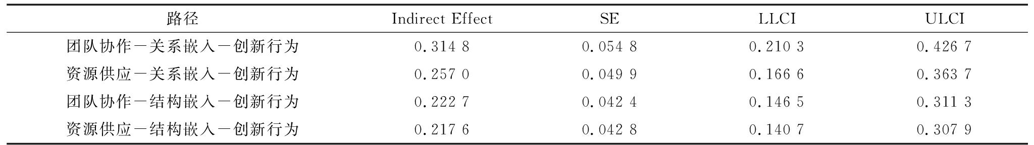 结果显示,关系嵌入在团队协作与创新行为之间的中介效应显著(间接效应值为0.314 8,CI95%为[0.210 3,0.426 7]),在资源供应与创新行为之间的中介效应显著(间接效应值为0.257 0,CI95%为[0.166 6,0.363 7]);结构嵌入在团队协作与创新行为之间的中介效应显著(间接效应值为0.222 7,CI95%为[0.146 5,0.311 3]),在资源供应与创新行为之间的中介效应显著(间接效应值为0.217 6, CI95%为[0.140 7,0.307 9])。因此,假设H4a、H4c、H4d和H4f成立。