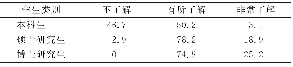 学生类别 不了解 有所了解 非常了解本科生 46.7 50.2 3.1硕士研究生 2.9 78.2 18.9博士研究生 0 74.8 25.2