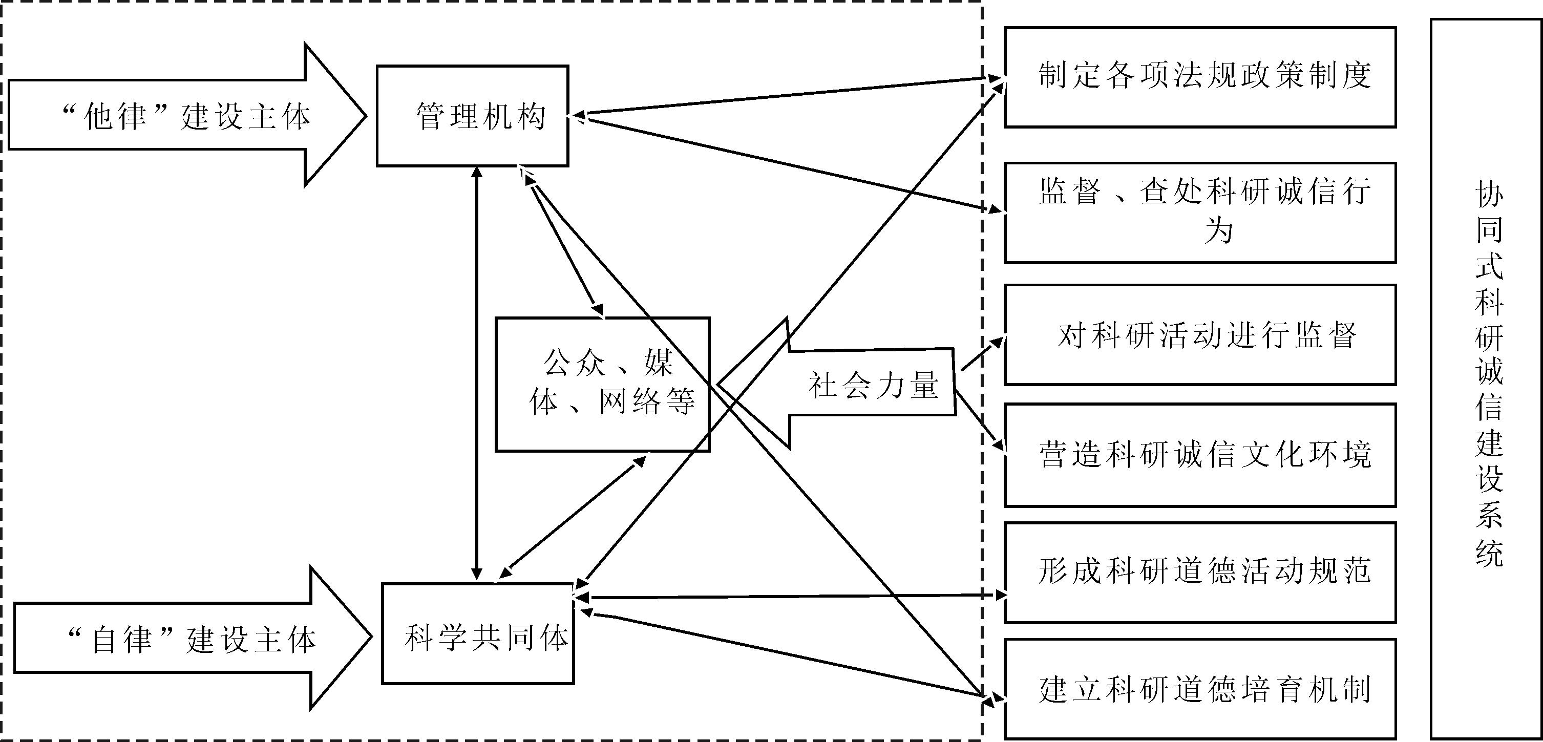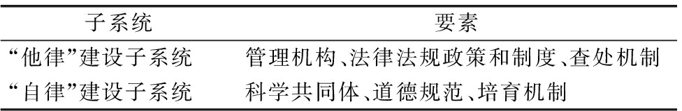 子系统要素“他律”建设子系统管理机构、法律法规政策和制度、查处机制“自律”建设子系统科学共同体、道德规范、培育机制
