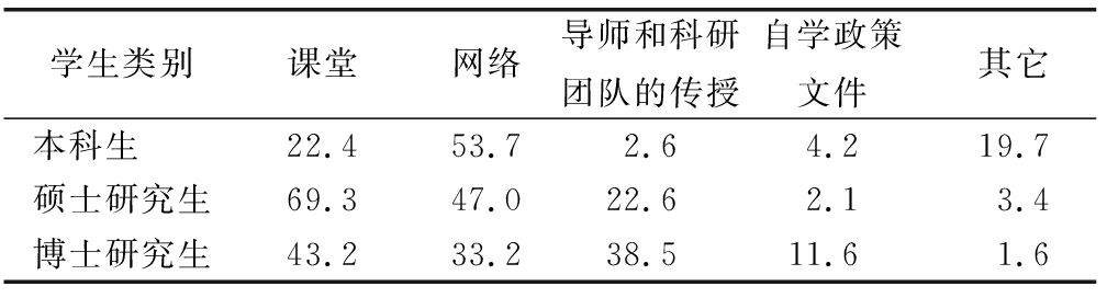 学生类别 课堂 网络 导师和科研团队的传授 自学政策文件 其它本科生 22.4 53.7 2.6 4.2 19.7硕士研究生 69.3 47.0 22.6 2.1 3.4博士研究生 43.2 33.2 38.5 11.6 1.6