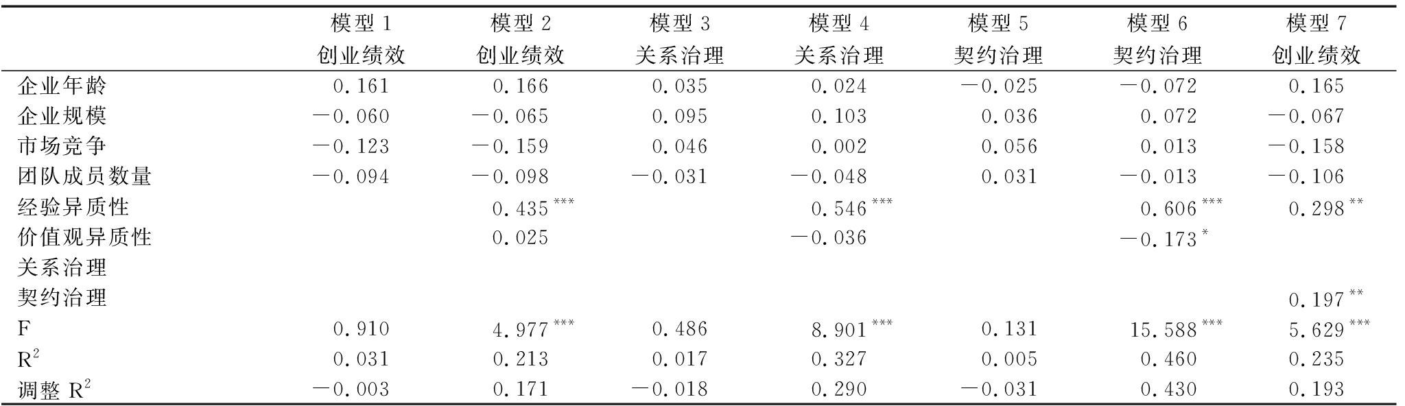 模型1模型2模型3模型4模型5模型6模型7创业绩效创业绩效关系治理关系治理契约治理契约治理创业绩效企业年龄0.1610.1660.0350.024-0.025-0.0720.165企业规模-0.060-0.0650.0950.1030.0360.072-0.067市场竞争-0.123-0.1590.0460.0020.0560.013-0.158团队成员数量-0.094-0.098-0.031-0.0480.031-0.013-0.106经验异质性0.435***0.546***0.606***0.298**价值观异质性0.025-0.036-0.173*关系治理契约治理0.197**F0.9104.977***0.4868.901***0.13115.588***5.629***R20.0310.2130.0170.3270.0050.4600.235调整R2-0.0030.171-0.0180.290-0.0310.4300.193
