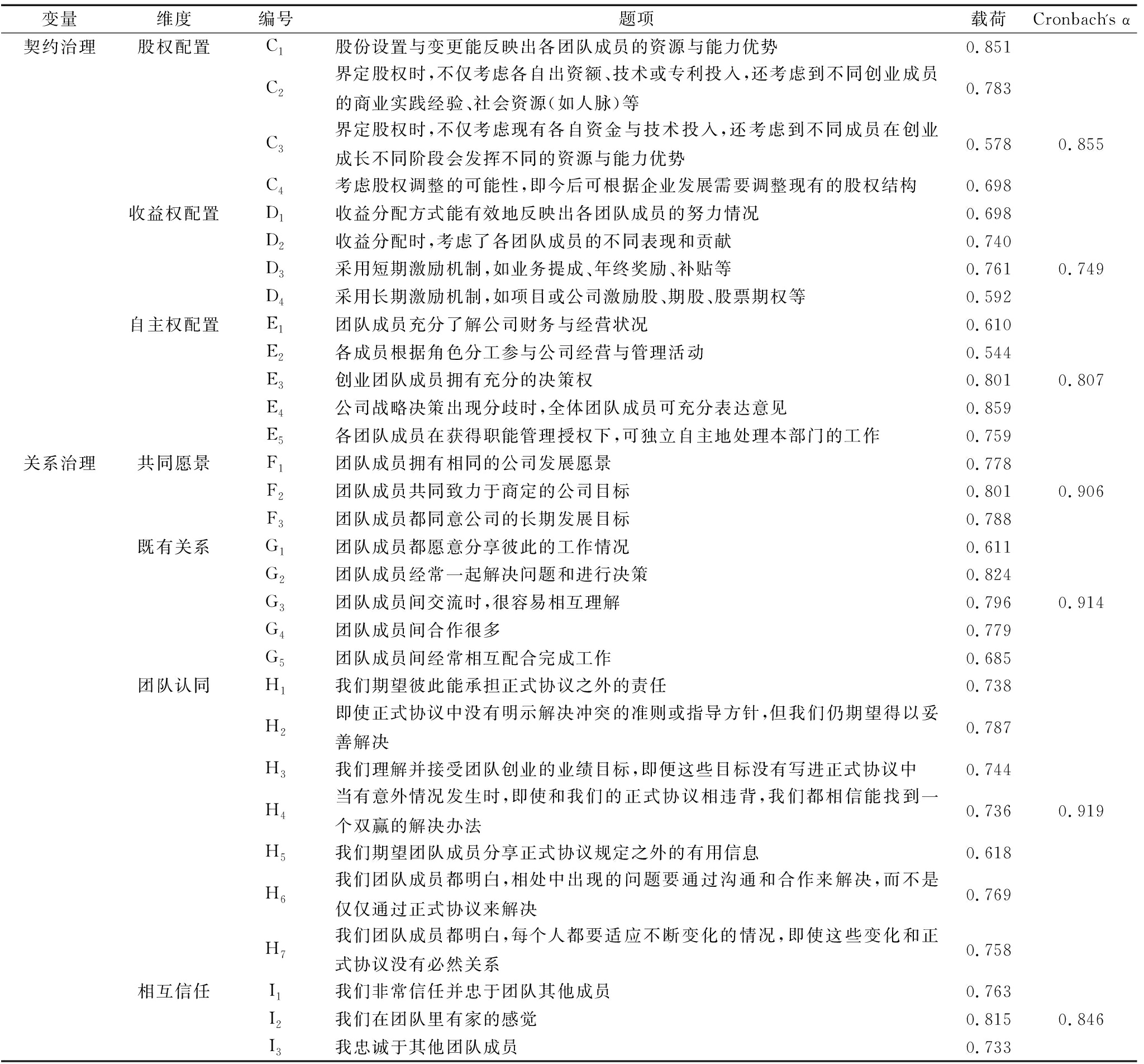 变量维度编号题项载荷Cronbach's α契约治理股权配置C1股份设置与变更能反映出各团队成员的资源与能力优势0.851C2界定股权时,不仅考虑各自出资额、技术或专利投入,还考虑到不同创业成员的商业实践经验、社会资源(如人脉)等0.783C3界定股权时,不仅考虑现有各自资金与技术投入,还考虑到不同成员在创业成长不同阶段会发挥不同的资源与能力优势0.5780.855C4考虑股权调整的可能性,即今后可根据企业发展需要调整现有的股权结构0.698收益权配置D1收益分配方式能有效地反映出各团队成员的努力情况0.698D2收益分配时,考虑了各团队成员的不同表现和贡献0.740D3采用短期激励机制,如业务提成、年终奖励、补贴等0.7610.749D4采用长期激励机制,如项目或公司激励股、期股、股票期权等0.592自主权配置E1团队成员充分了解公司财务与经营状况0.610E2各成员根据角色分工参与公司经营与管理活动0.544E3创业团队成员拥有充分的决策权0.8010.807E4公司战略决策出现分歧时,全体团队成员可充分表达意见0.859E5各团队成员在获得职能管理授权下,可独立自主地处理本部门的工作0.759关系治理共同愿景F1团队成员拥有相同的公司发展愿景0.778F2团队成员共同致力于商定的公司目标 0.8010.906F3团队成员都同意公司的长期发展目标0.788既有关系G1团队成员都愿意分享彼此的工作情况0.611G2团队成员经常一起解决问题和进行决策0.824G3团队成员间交流时,很容易相互理解0.7960.914G4团队成员间合作很多0.779G5团队成员间经常相互配合完成工作0.685团队认同H1我们期望彼此能承担正式协议之外的责任0.738H2即使正式协议中没有明示解决冲突的准则或指导方针,但我们仍期望得以妥善解决0.787H3我们理解并接受团队创业的业绩目标,即便这些目标没有写进正式协议中0.744H4当有意外情况发生时,即使和我们的正式协议相违背,我们都相信能找到一个双赢的解决办法0.7360.919H5我们期望团队成员分享正式协议规定之外的有用信息0.618H6我们团队成员都明白,相处中出现的问题要通过沟通和合作来解决,而不是仅仅通过正式协议来解决0.769H7我们团队成员都明白,每个人都要适应不断变化的情况,即使这些变化和正式协议没有必然关系0.758相互信任I1我们非常信任并忠于团队其他成员0.763I2我们在团队里有家的感觉0.8150.846I3我忠诚于其他团队成员0.733