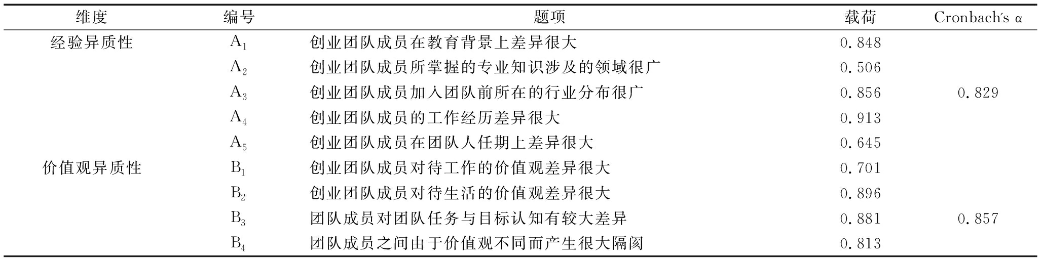 维度编号题项载荷Cronbach's α经验异质性A1创业团队成员在教育背景上差异很大0.848A2创业团队成员所掌握的专业知识涉及的领域很广0.506A3创业团队成员加入团队前所在的行业分布很广0.8560.829A4创业团队成员的工作经历差异很大0.913A5创业团队成员在团队人任期上差异很大0.645价值观异质性B1创业团队成员对待工作的价值观差异很大0.701B2创业团队成员对待生活的价值观差异很大0.896B3团队成员对团队任务与目标认知有较大差异0.8810.857B4团队成员之间由于价值观不同而产生很大隔阂0.813