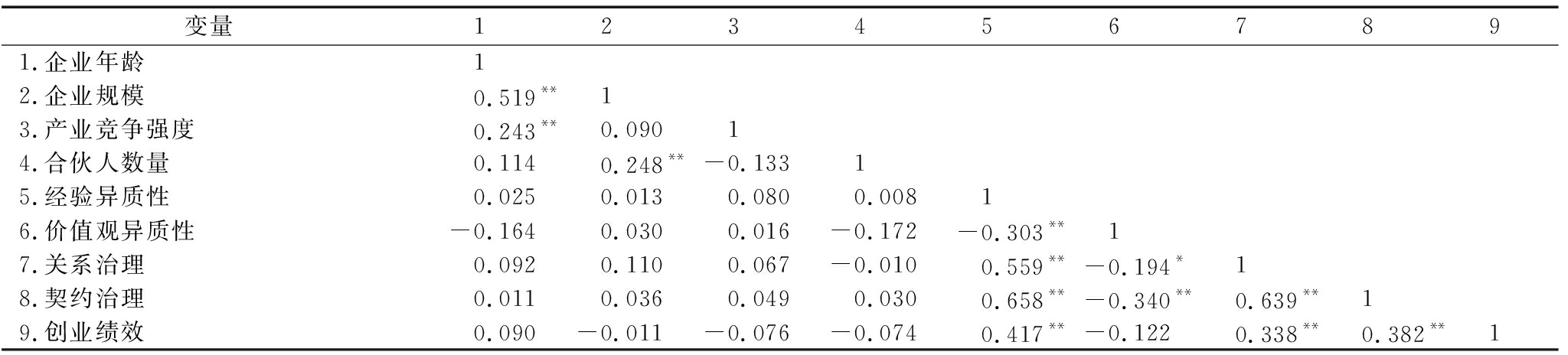 变量1234567891.企业年龄12.企业规模0.519**13.产业竞争强度0.243**0.09014.合伙人数量0.1140.248**-0.13315.经验异质性0.0250.0130.0800.00816.价值观异质性-0.1640.0300.016-0.172-0.303**17.关系治理0.0920.1100.067-0.0100.559**-0.194*18.契约治理0.0110.0360.0490.0300.658**-0.340**0.639**19.创业绩效0.090-0.011-0.076-0.0740.417**-0.1220.338**0.382**1
