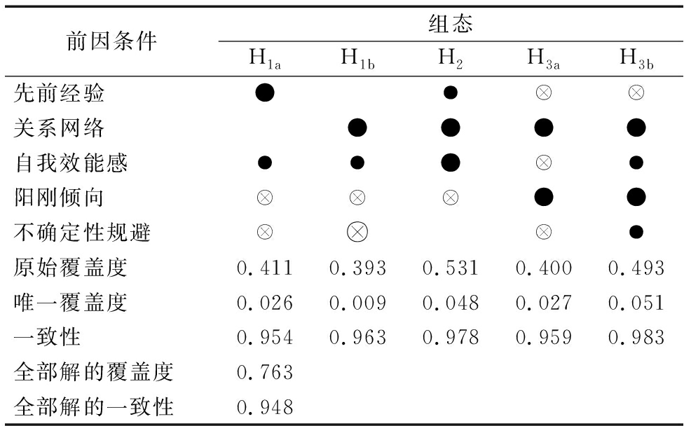 前因条件组态H1aH1bH2H3aH3b先前经验●●关系网络●●●●自我效能感●●●●阳刚倾向●●不确定性规避●原始覆盖度0.4110.3930.5310.4000.493唯一覆盖度0.0260.0090.0480.0270.051一致性0.9540.9630.9780.9590.983全部解的覆盖度0.763全部解的一致性0.948