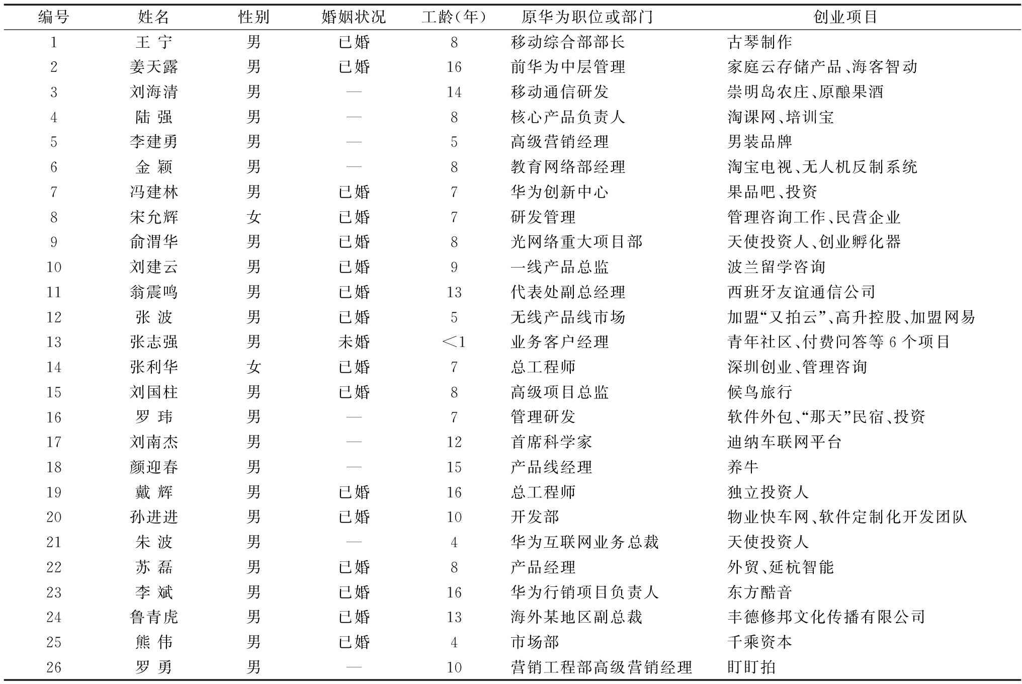 编号姓名性别婚姻状况工龄(年)原华为职位或部门 创业项目 1王 宁男已婚8移动综合部部长古琴制作2姜天露男已婚16前华为中层管理家庭云存储产品、海客智动3刘海清男—14移动通信研发崇明岛农庄、原酿果酒4陆 强男—8核心产品负责人淘课网、培训宝5李建勇男—5高级营销经理男装品牌6金 颖男—8教育网络部经理淘宝电视、无人机反制系统7冯建林男已婚7华为创新中心果品吧、投资8宋允辉女已婚7研发管理管理咨询工作、民营企业9俞渭华男已婚8光网络重大项目部天使投资人、创业孵化器10刘建云男已婚9一线产品总监波兰留学咨询11翁震鸣男已婚13代表处副总经理西班牙友谊通信公司12张 波男已婚5无线产品线市场加盟“又拍云”、高升控股、加盟网易13张志强男未婚<1业务客户经理青年社区、付费问答等6个项目14张利华女已婚7总工程师深圳创业、管理咨询15刘国柱男已婚8高级项目总监候鸟旅行16罗 玮男—7管理研发软件外包、“那天”民宿、投资17刘南杰男—12首席科学家迪纳车联网平台18颜迎春男—15产品线经理养牛19戴 辉男已婚16总工程师独立投资人20孙进进男已婚10开发部物业快车网、软件定制化开发团队21朱 波男—4华为互联网业务总裁天使投资人22苏 磊男已婚8产品经理外贸、延杭智能23李 斌男已婚16华为行销项目负责人东方酷音24鲁青虎男已婚13海外某地区副总裁丰德修邦文化传播有限公司25熊 伟男已婚4市场部千乘资本26罗 勇男—10营销工程部高级营销经理盯盯拍