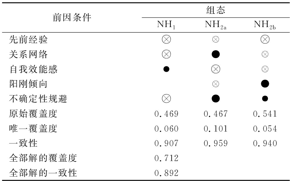 前因条件组态NH1NH2aNH2b先前经验关系网络●自我效能感●阳刚倾向●不确定性规避●●原始覆盖度0.4690.4670.541唯一覆盖度0.0600.1010.054一致性0.9070.9590.940全部解的覆盖度0.712全部解的一致性0.892